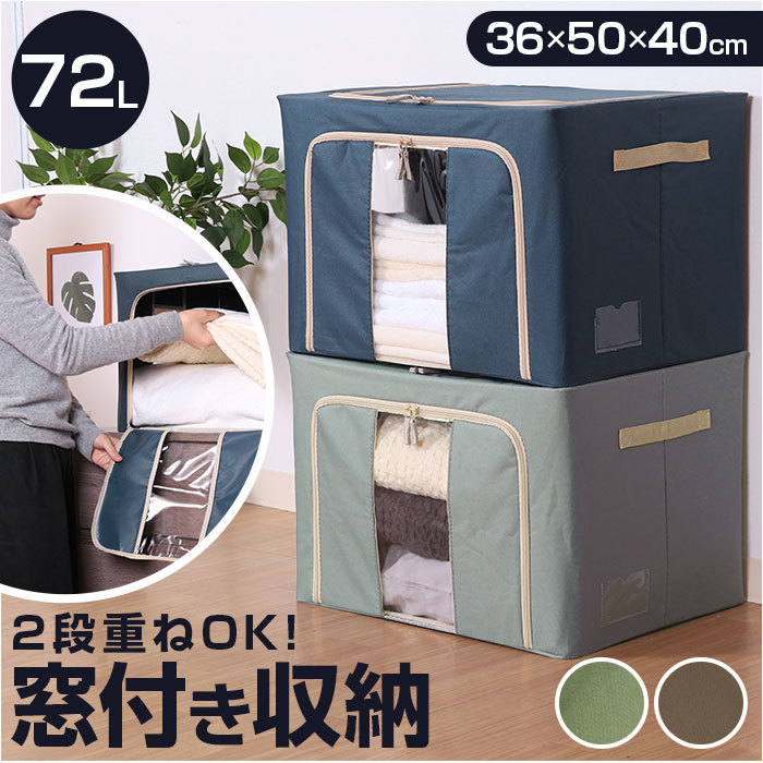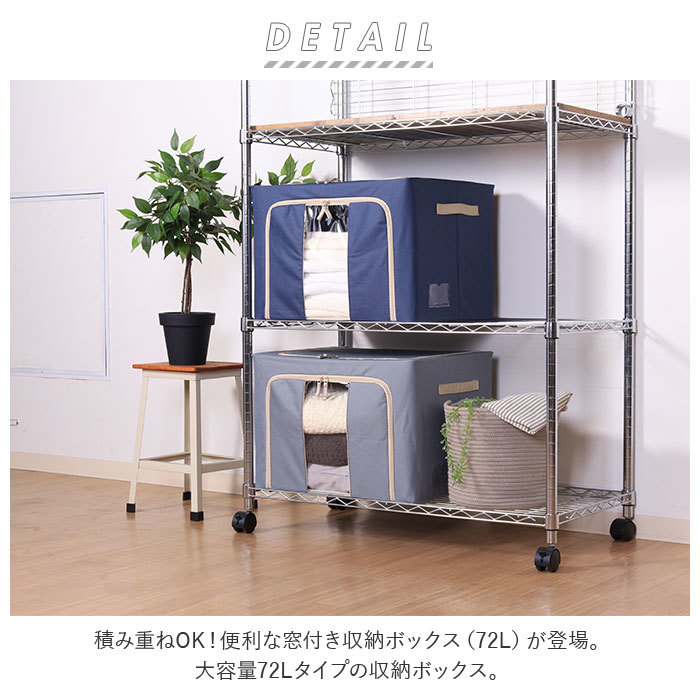 | 商品説明 | ・・積み重ねOK!便利な窓付き収納ボックス(72L)が登場。 ・大容量72Lタイプの収納ボックス。 ・上部と正面にダブルファスナー式の取り出し口を配置!物の出し入れがとってもスムーズ◎ ・中身が見える窓付きで、中身がひと目で確認できるのも嬉しいポイント。 ・最大2段まで積み重ねて置けるので、スペースを有効活用♪重ねたままでも、正面の取り出し口からサッと開けられて便利。 ・スチールフレームを装備しており、安定性もばっちり! ・使わない時は折りたたんで、コンパクトに収納可能。 ・側面(片側)に中身を記入したメモを入れておけるクリアポケット付き。 ・持ち手もあるので持ち運びがラクラク。 ・シーズンオフの洋服や毛布などの収納に最適◎ |