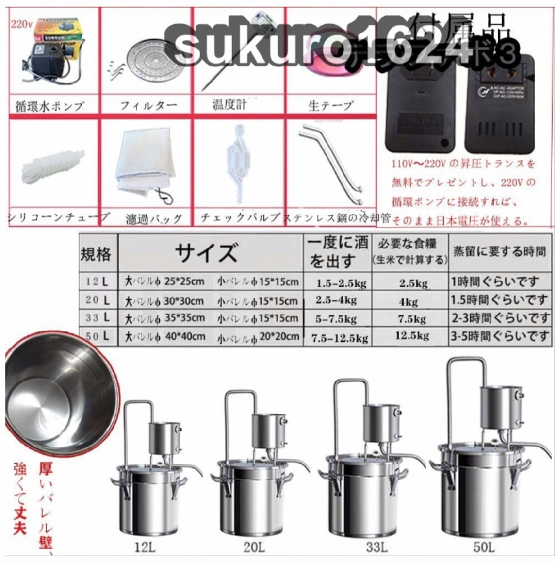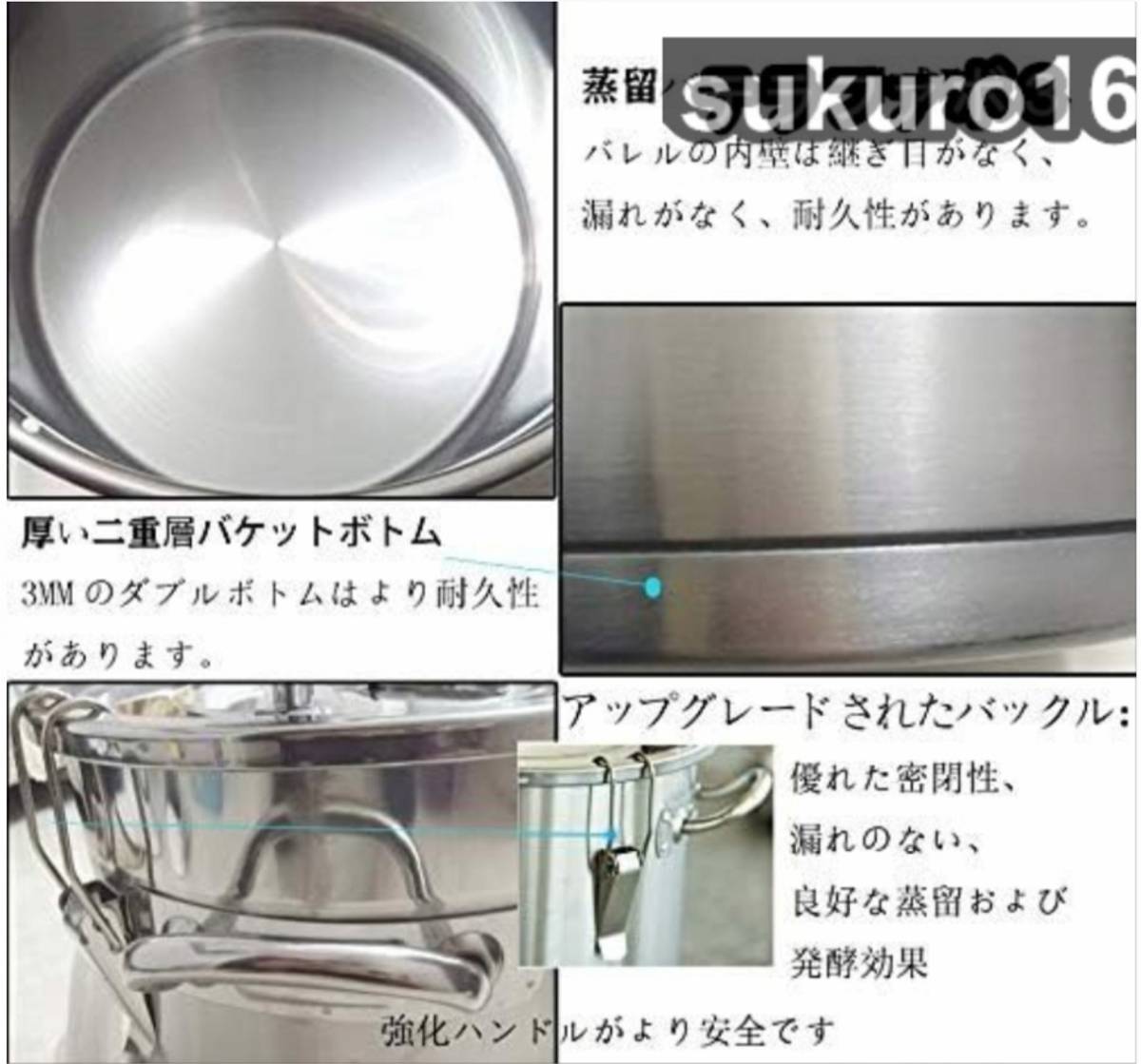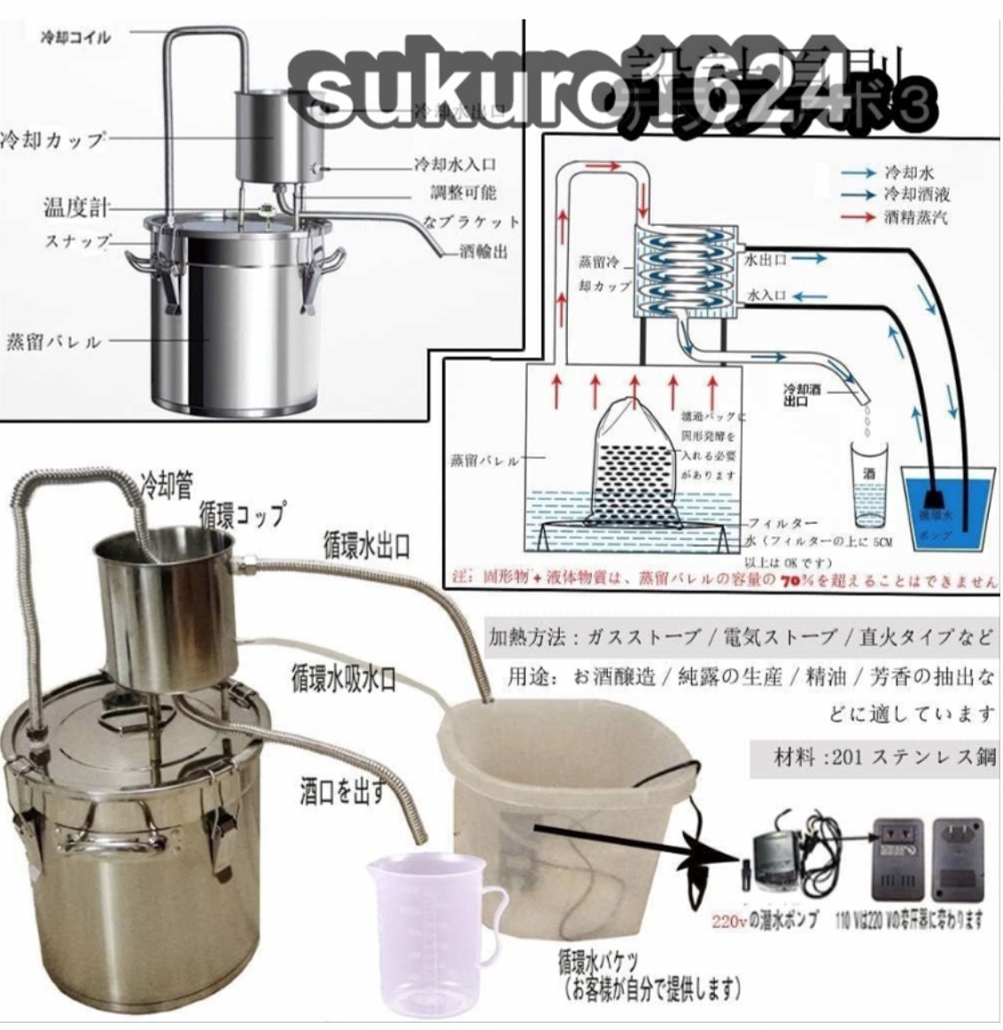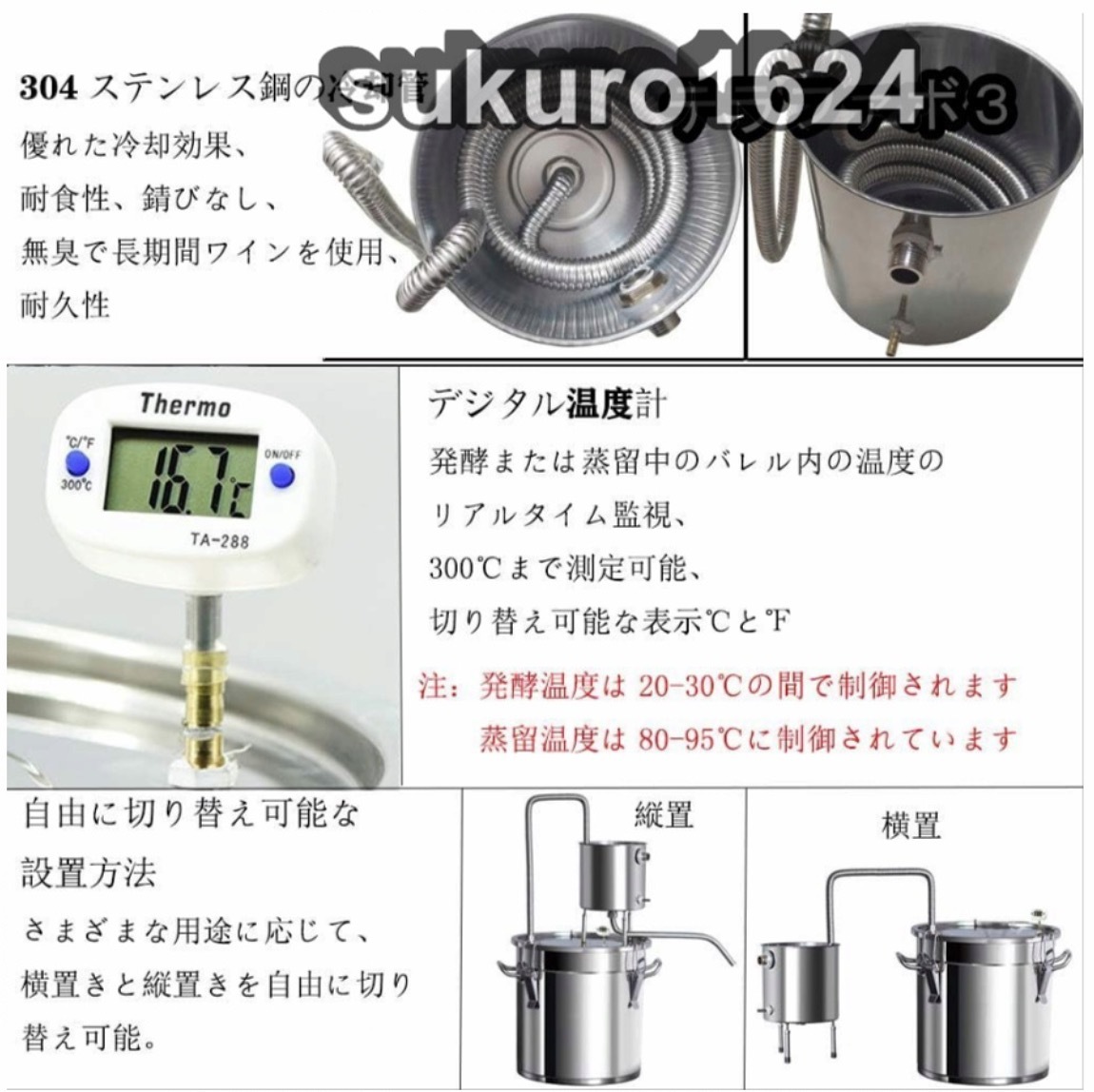 ★状態:新品未使用 材料:201ステンレス鋼、 美しいデザイン、耐久性、掃除が簡単、さびを防ぐ、耐食性。.せいしゅ、お酒の醸造、ブランデーの醸造、純露の生産、精油、芳香 の抽出などに適しています。 3種類の加熱方法:ガスストーブ/電気ストーブ/直火タイプなど、便利で実用的です。家族、研究室、個人スタジオ、学校などに適しています. 厚いダブルボトムバケット:蒸留バレルの内壁は一体成形されており、バレルの内壁は漏れのないシームレスで耐久性に優れています、添付の3MMダブルボトムはより耐久性があります。 優れた冷却効果:304ステンレス鋼製の冷却コイル、錆のない、速い熱伝導、均一な熱、速い熱放散、ワインのより良い香り。 温度計付き:発酵タンク温度のリアルタイム監視。ステンレス鋼のバレルの底部は、糊付けされた厚底で作られていますので、付着する心配はありません 自由な組み合わせ:循環カップは移動できます。アプリケーションシナリオに応じて、酒蒸留器を水平または垂直に変更できます。