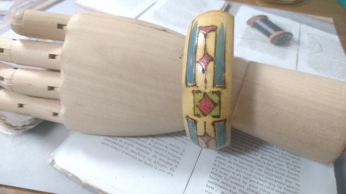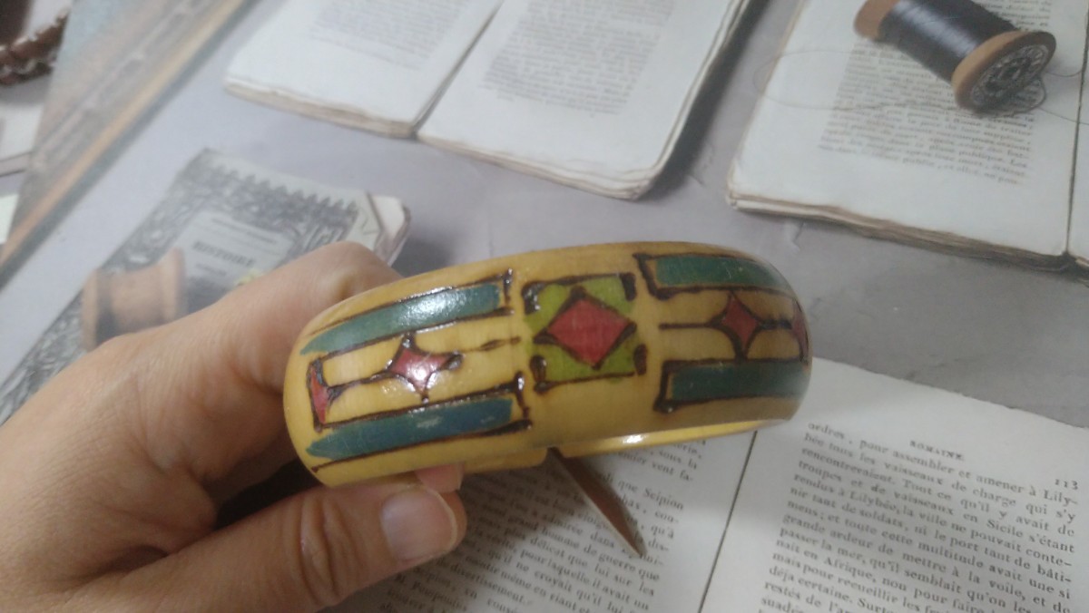 エスニック&オリエンタル感 模様入り・ウッドバングル ベージュ×赤×青 | |||