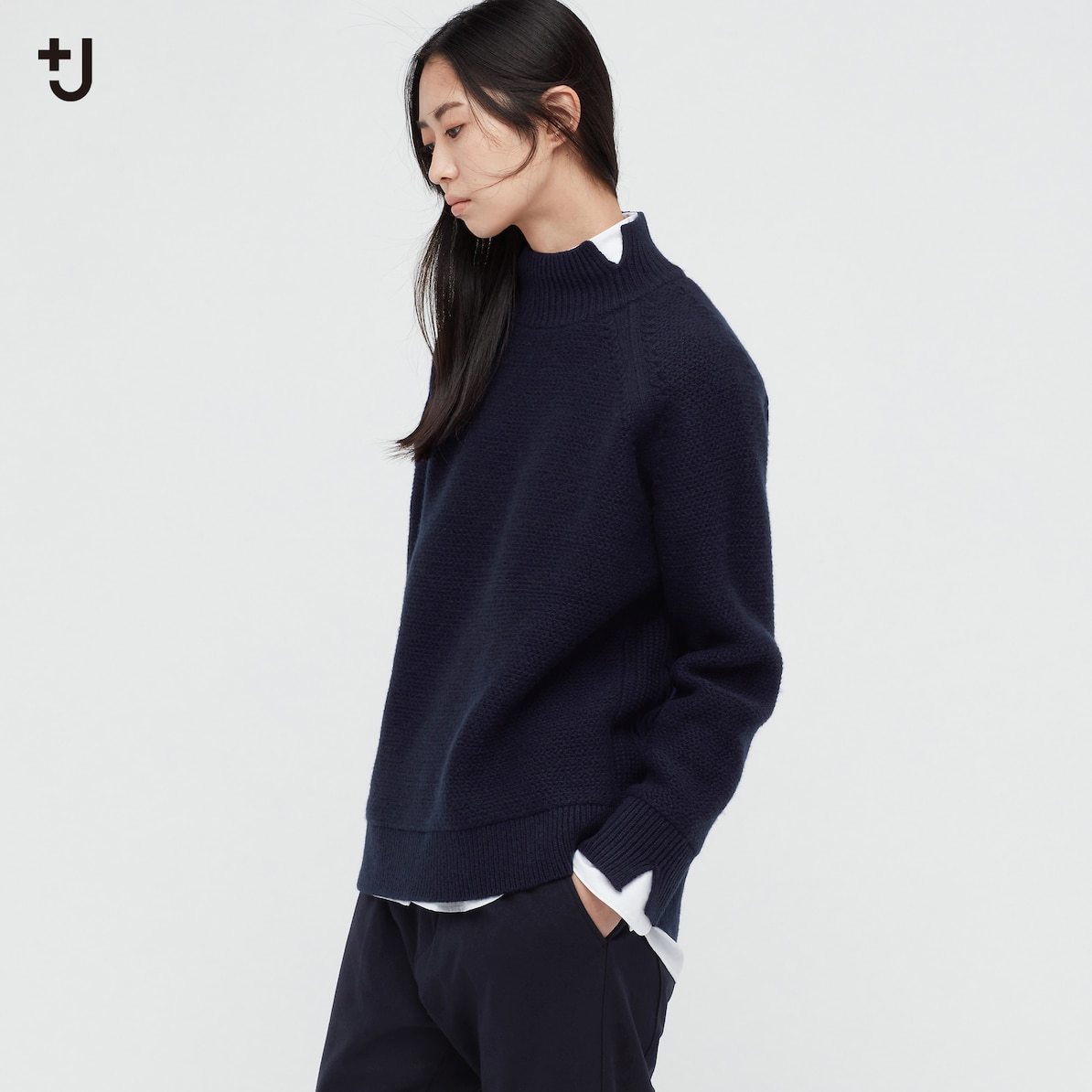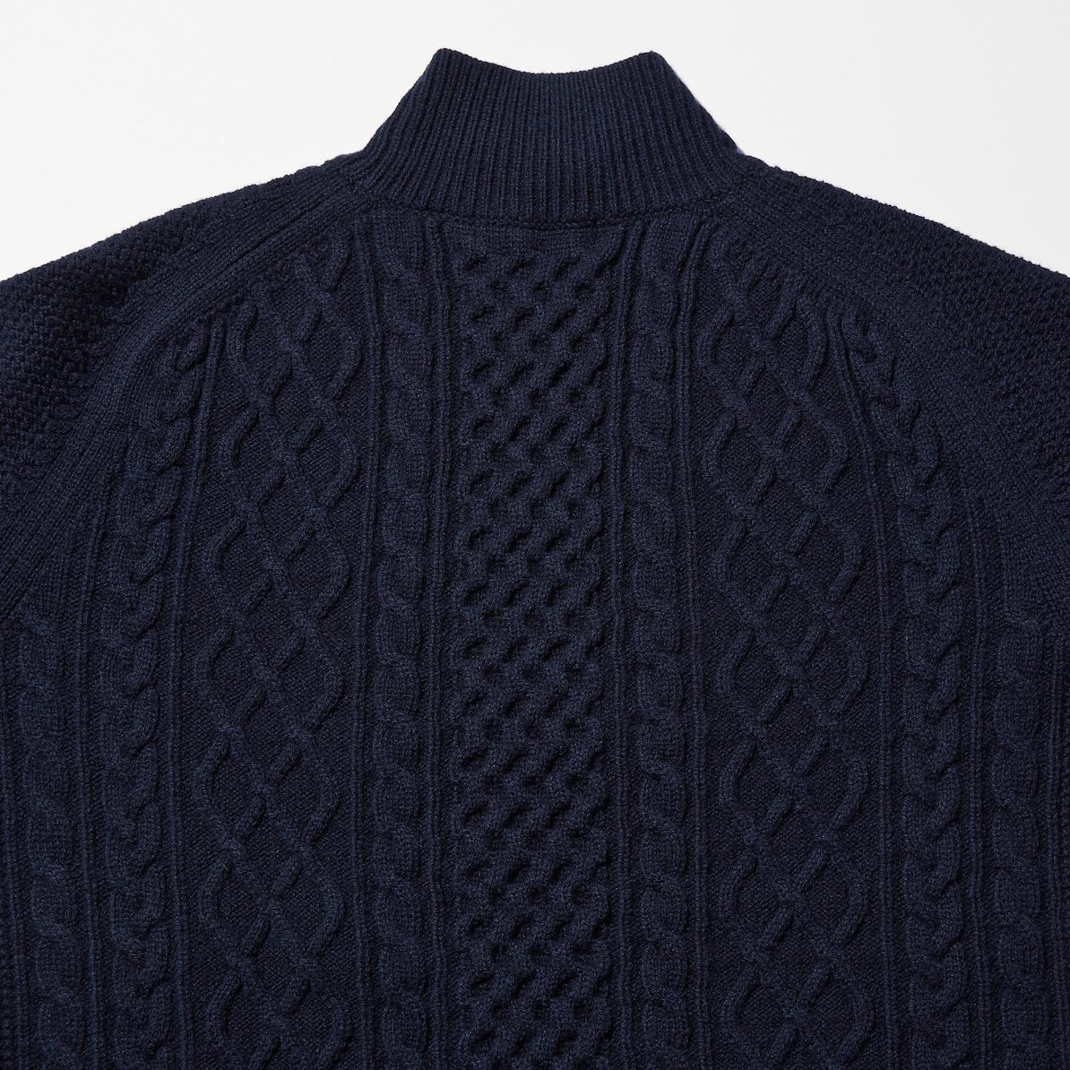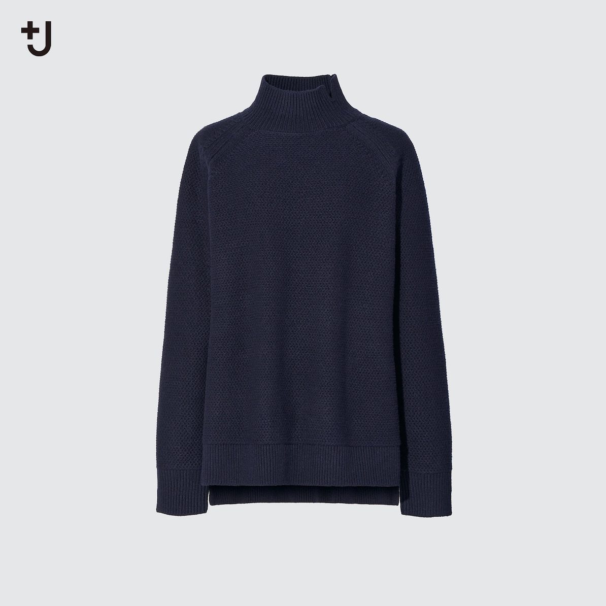 UNIQLO +J/21AW プレミアムラムケーブルハイネックセーター【NAVY、3XLサイズ】になります。3XLサイズはオンラインストアのみ取扱。ジル・サンダー氏とコラボレーションプロジェクト『+J』ラストコレクションのアイコン的なアイテムのニット。後ろ身頃にのみケーブル柄で前後違った印象、襟や袖のリブにはスリットを入れてディテールにもこだわりが感じられます。肉厚な高品質19.5マイクロンの100%ウールを使用。購入先は『ユニクロオンラインストア』です。