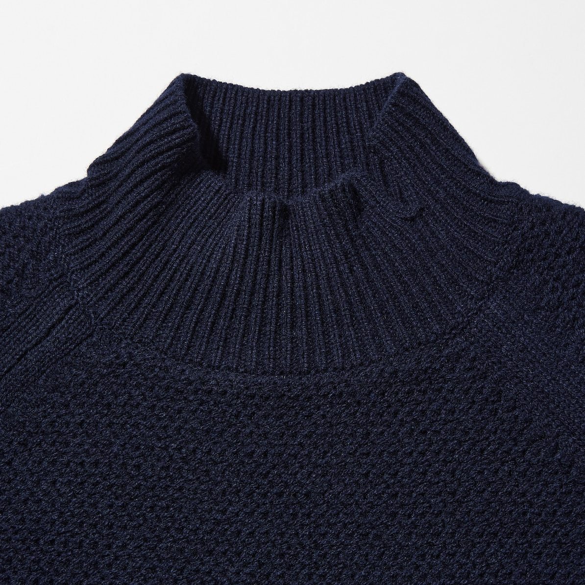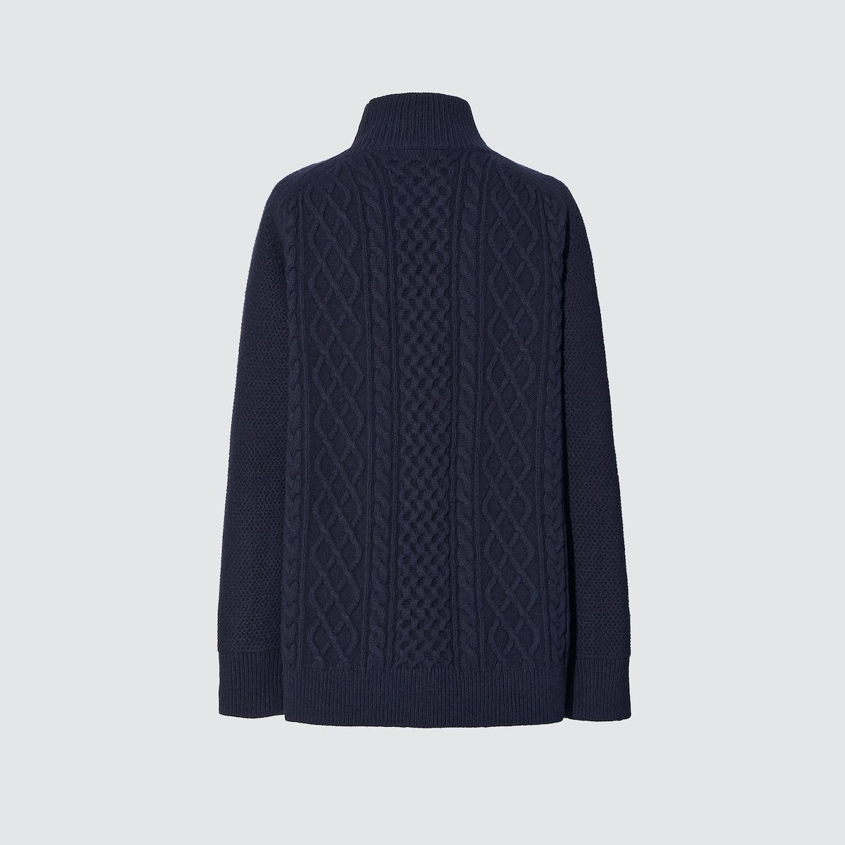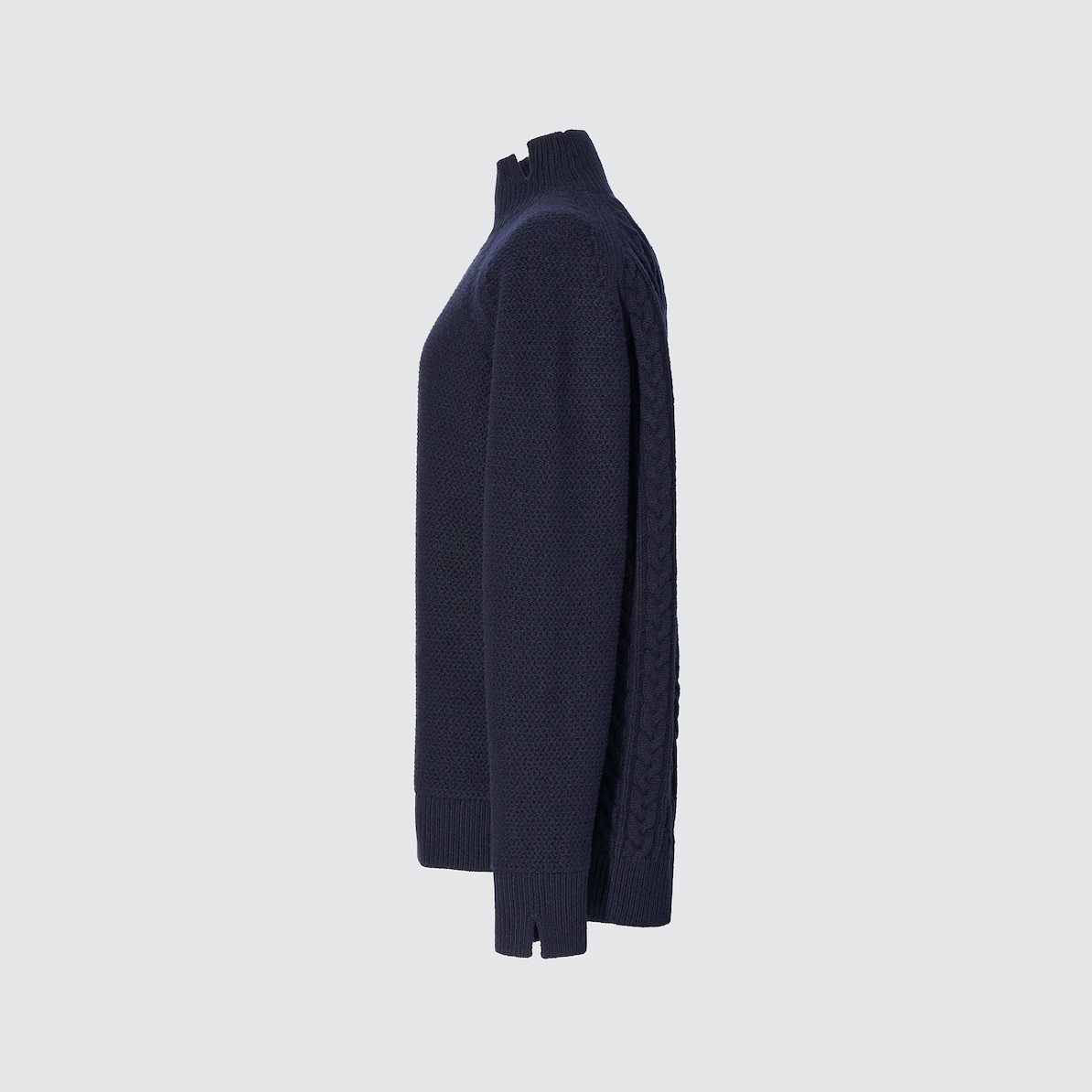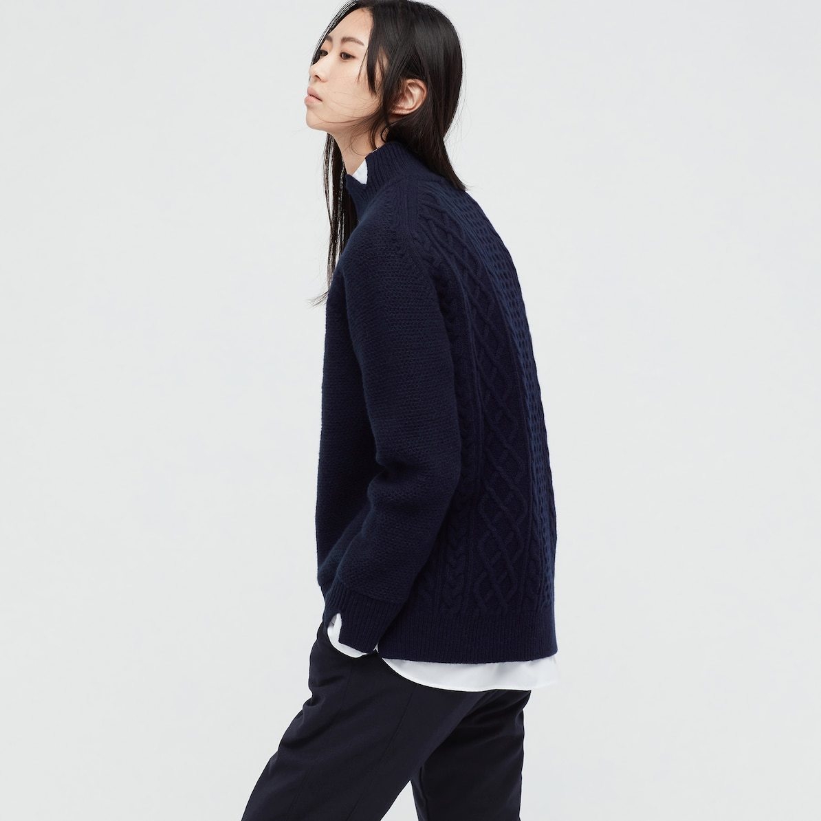 UNIQLO +J/21AW プレミアムラムケーブルハイネックセーター【NAVY、3XLサイズ】になります。3XLサイズはオンラインストアのみ取扱。ジル・サンダー氏とコラボレーションプロジェクト『+J』ラストコレクションのアイコン的なアイテムのニット。後ろ身頃にのみケーブル柄で前後違った印象、襟や袖のリブにはスリットを入れてディテールにもこだわりが感じられます。肉厚な高品質19.5マイクロンの100%ウールを使用。購入先は『ユニクロオンラインストア』です。