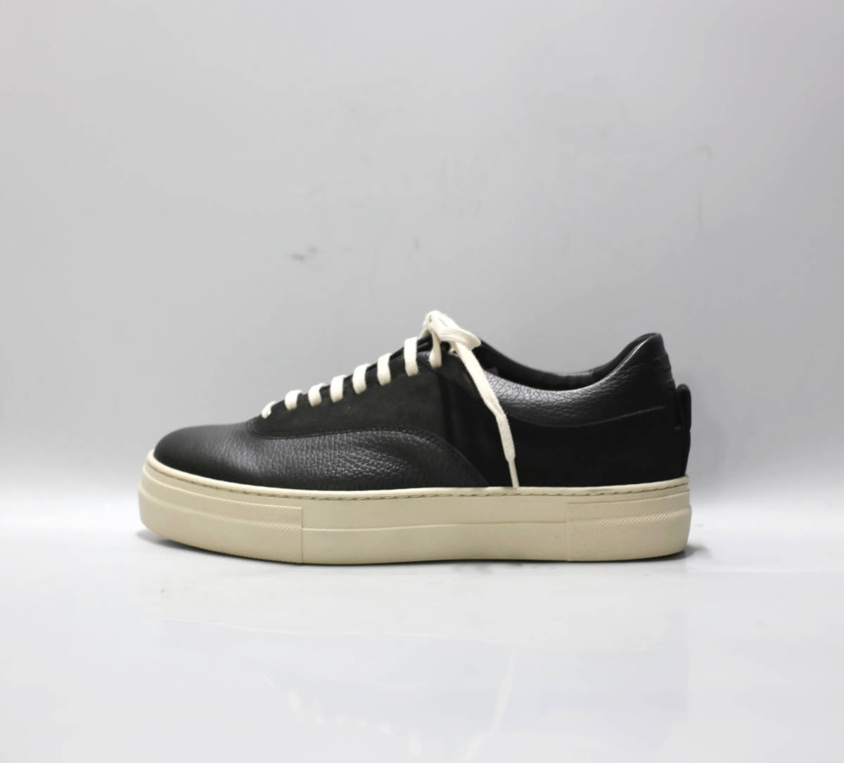 ブラックレザーをベースに、半ツヤのシボ革とマットなヌバックレザーを組み合わせた、上質で個性的な一足です。異なる質感のコントラストが、足元にさりげない存在感を演出します。