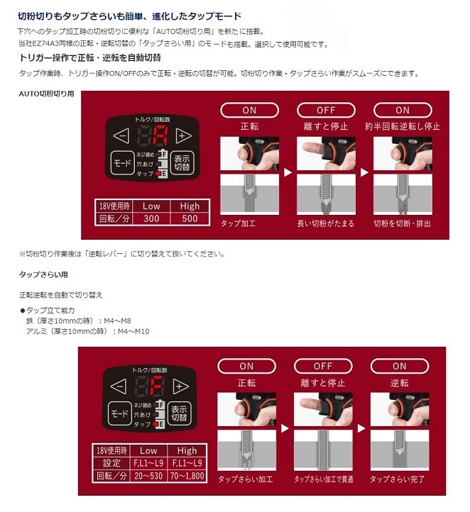 当社EZ74A3同様の正転・逆転切替の「タップさらい用」のモードも搭載。