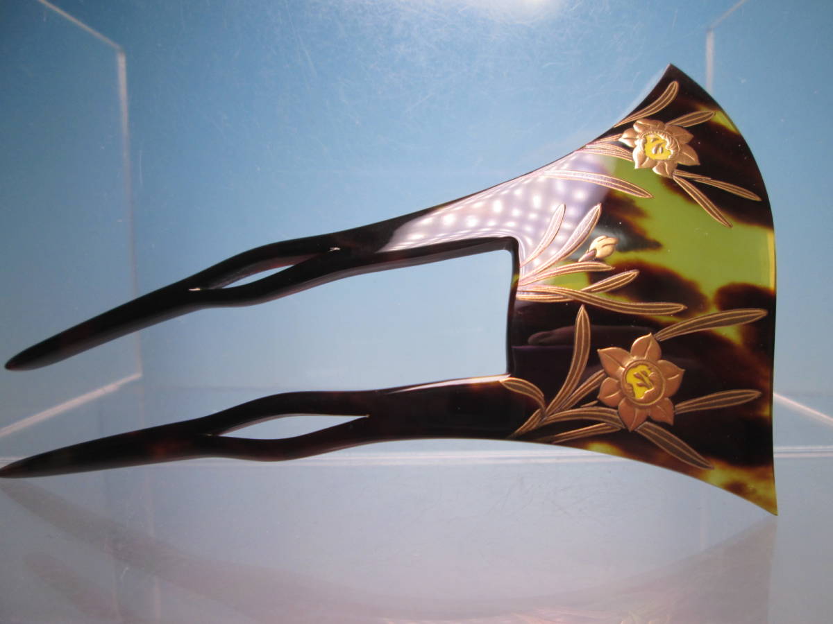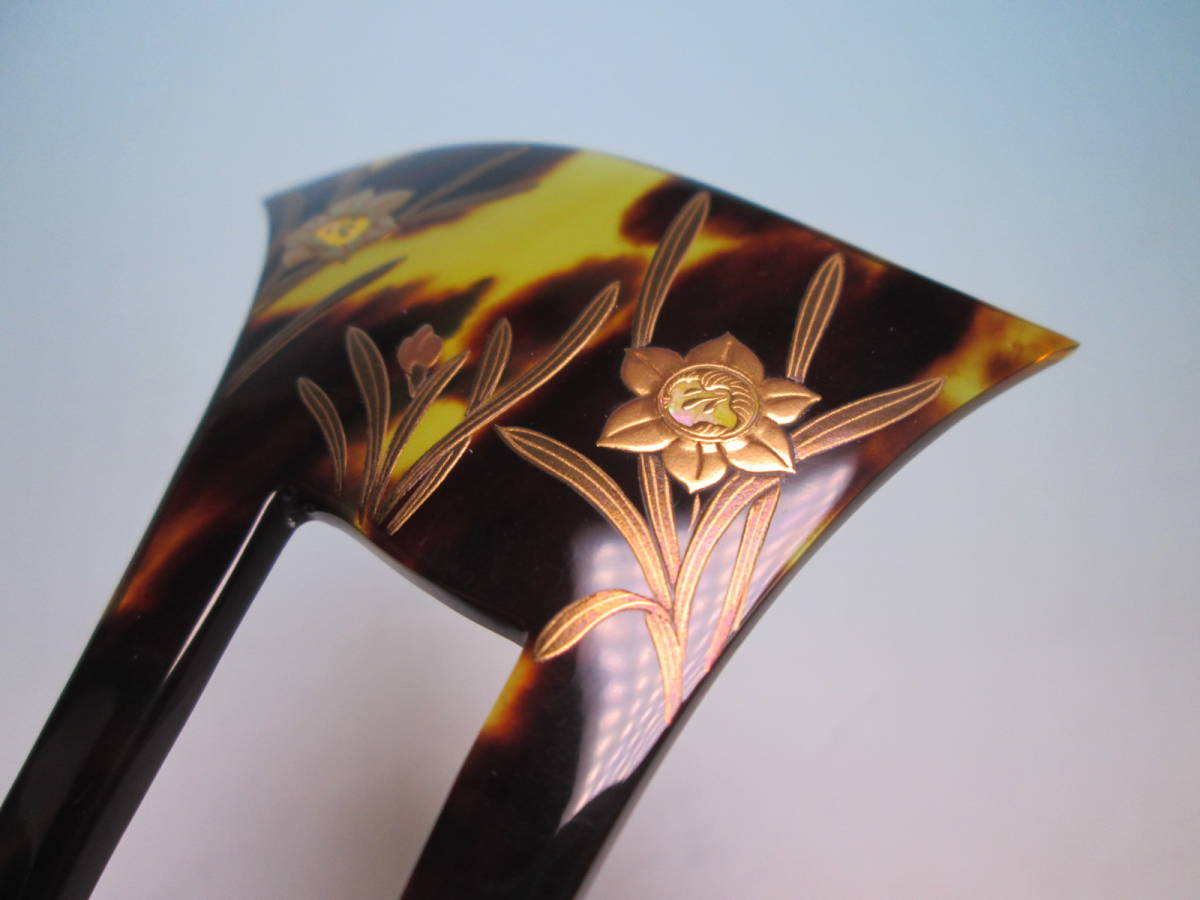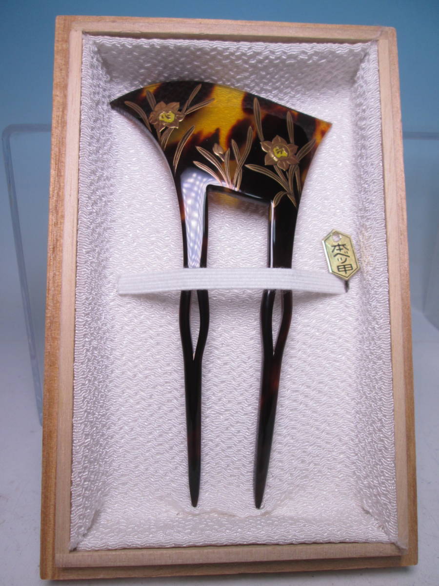 【江月】在銘 本鼈甲 水仙の花 螺鈿細工金蒔絵のかんざし 木箱付