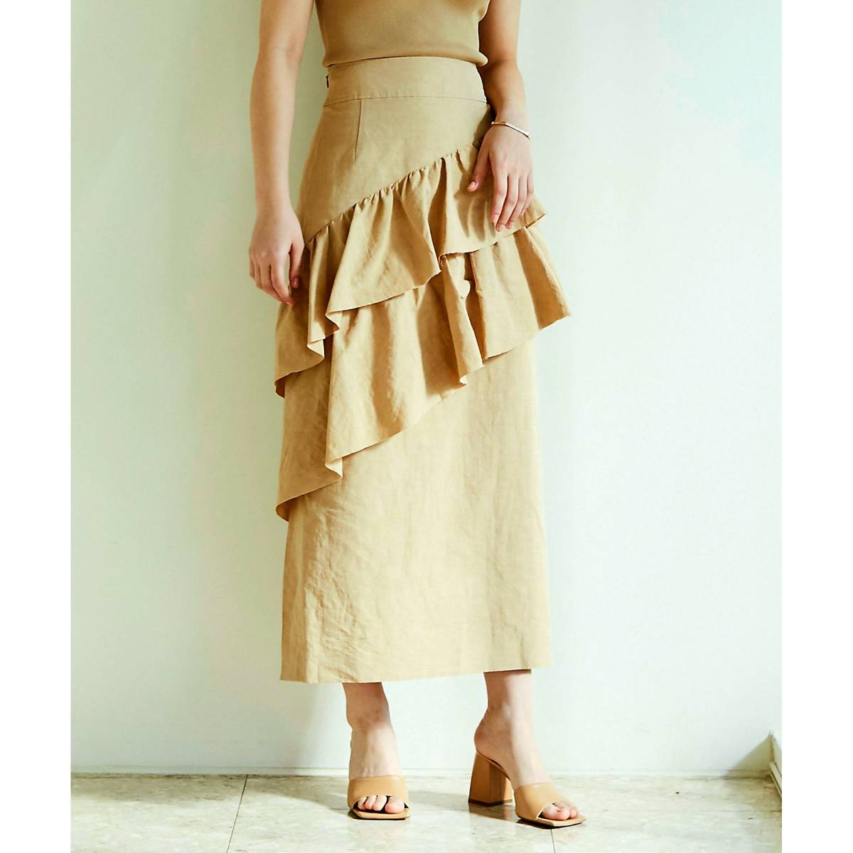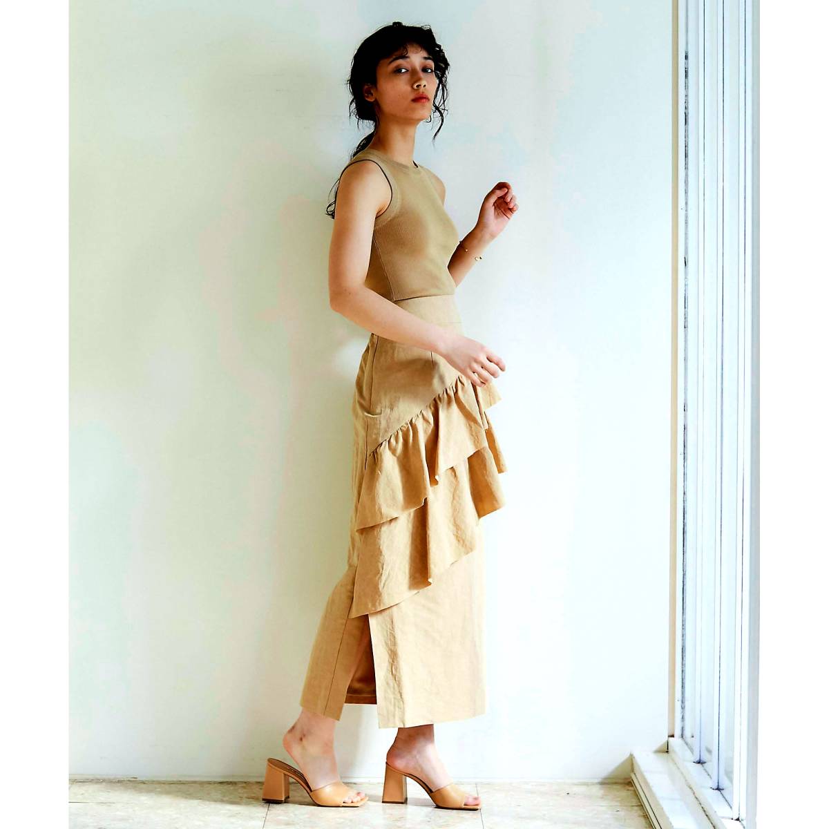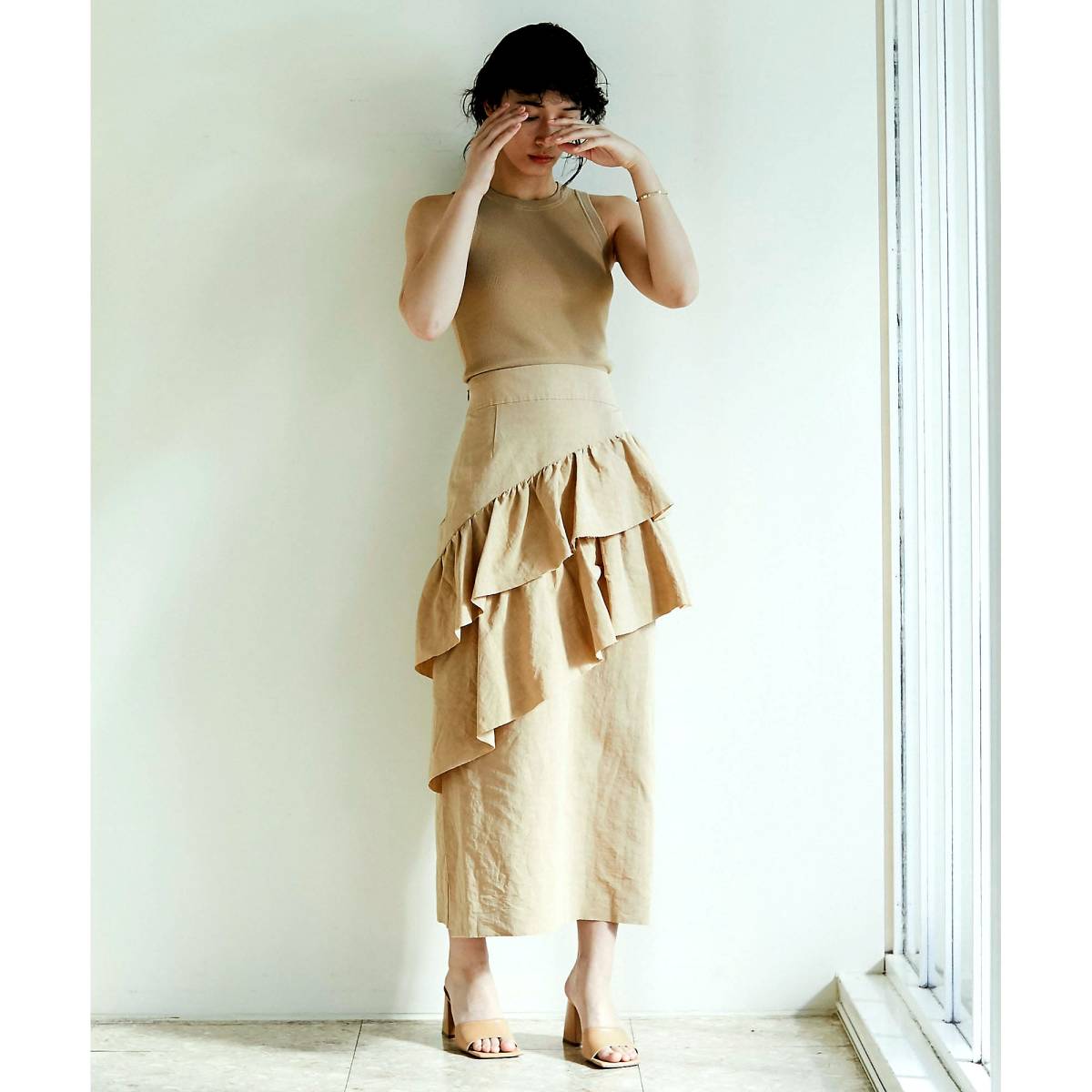 ハリ感のある麻混のタイプライター素材を使用、立体的なフリルがきれいに出ます。