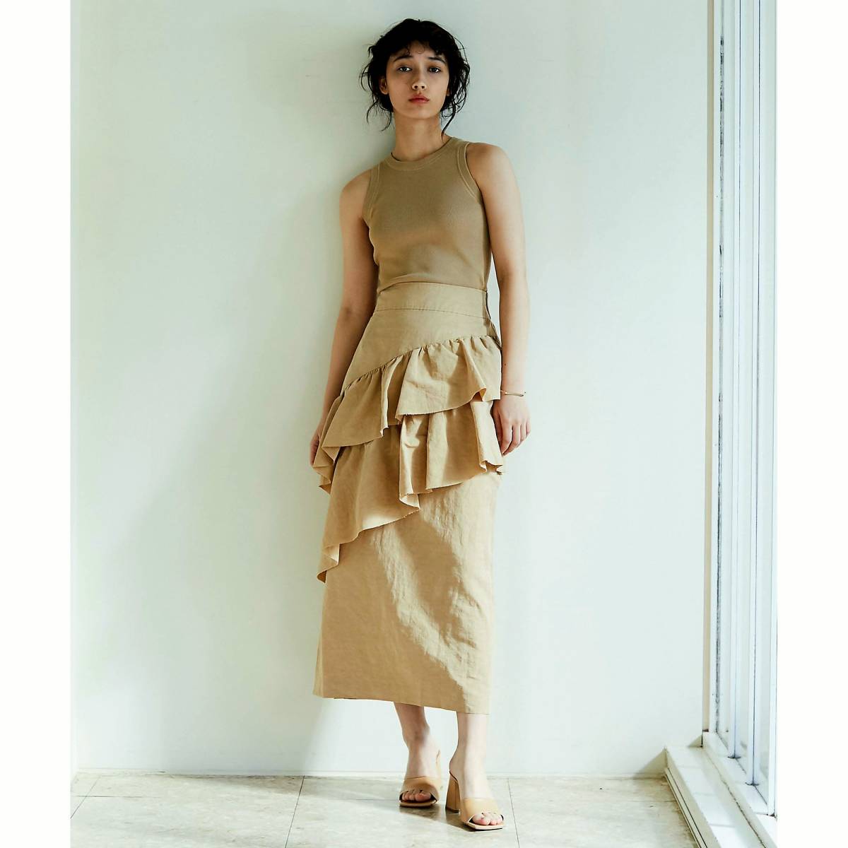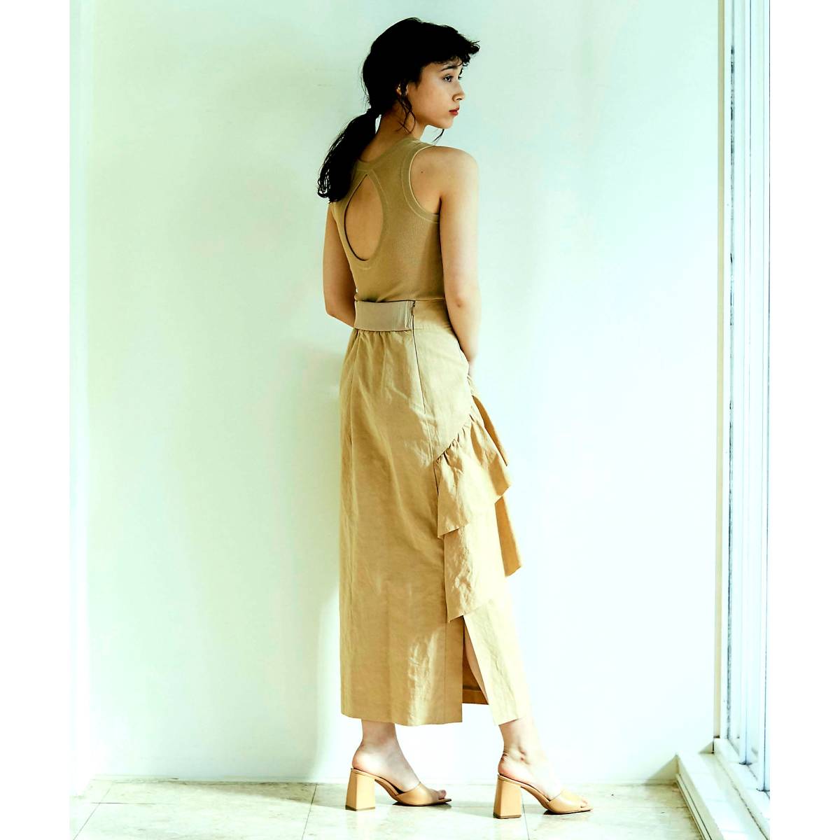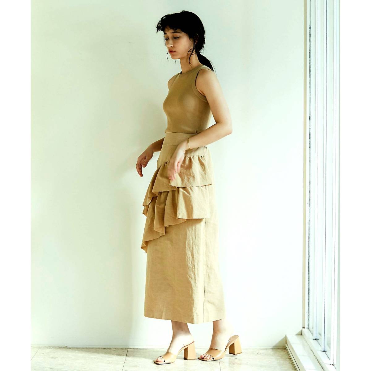 ハリ感のある麻混のタイプライター素材を使用、立体的なフリルがきれいに出ます。