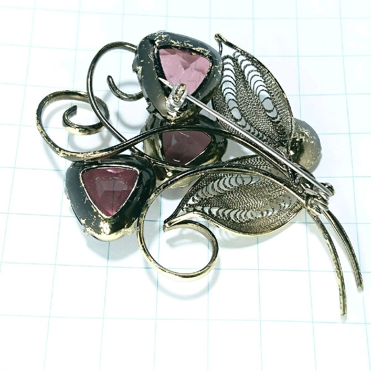 送料無料)ビンテージ☆パープルラインストーン お花モチーフ☆アンティークブローチ A14356