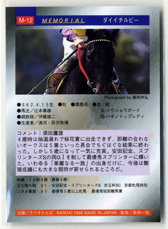 | ★ダイイチルビー M12(エラー版) メモリアルカード バンダイ サラブレッドカード 96年上半期版 河内洋 安田記念 スプリンターズS 写真 画像 競馬カード | |