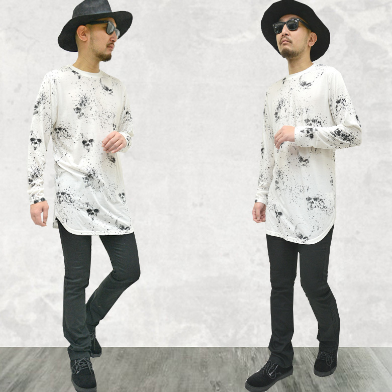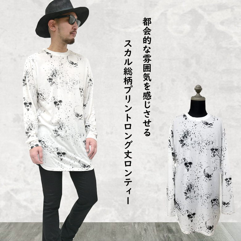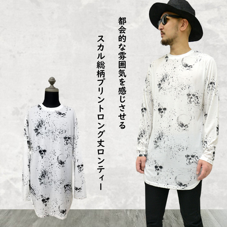 (ネコポス送料無料)Bernings-Shoスカル総柄ロング丈クルーネック長袖Tシャツ 3325-43  新品ホワイトL