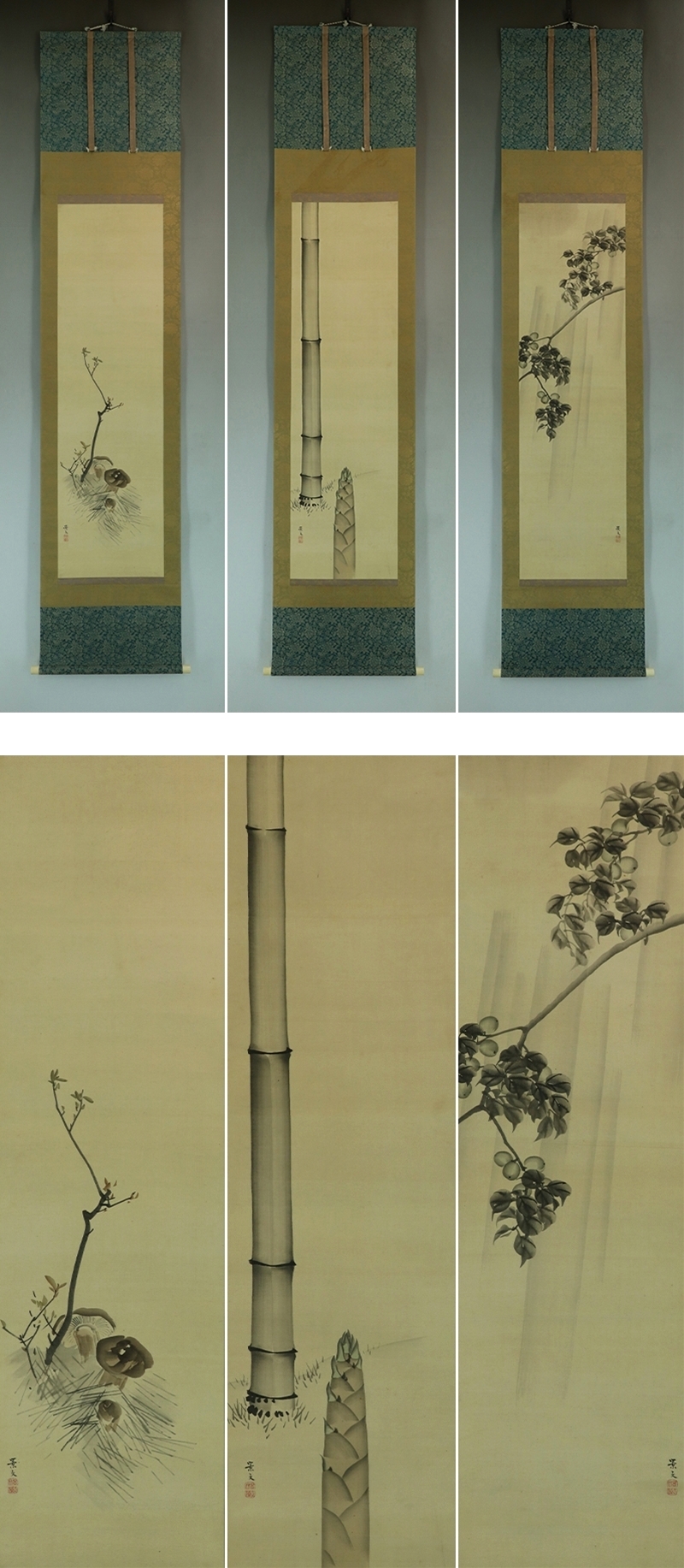 | №2211069【真作】松村景文【三対幅・慶祝図】◆絹本◆合箱◆掛軸 | |