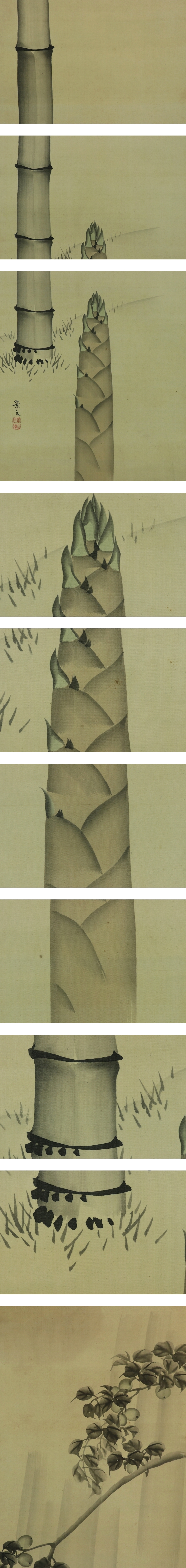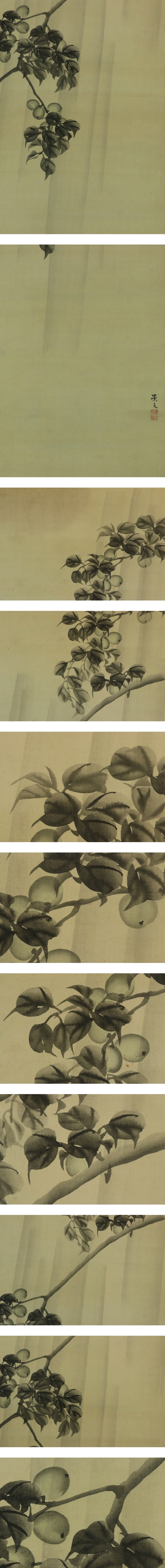 松村景文 まつむら-けいぶん(1779-1843) 江戸後期の四条派の画家。京都生。呉春の末弟。 通称は要人、幼名は直治、字は子藻、号は華渓。 兄より絵の指導を受け、また円山応挙の写生風を学び一家を成す。 天保14年(1843)歿、65才。 本紙は、染み、軽い皺、焼けがあります。 表装は、染み、汚れ、軽い皺があります。 【サイズ】 作品 横約33.5cm×縦約120cm 表装 横44.5cm×縦約206cm |
