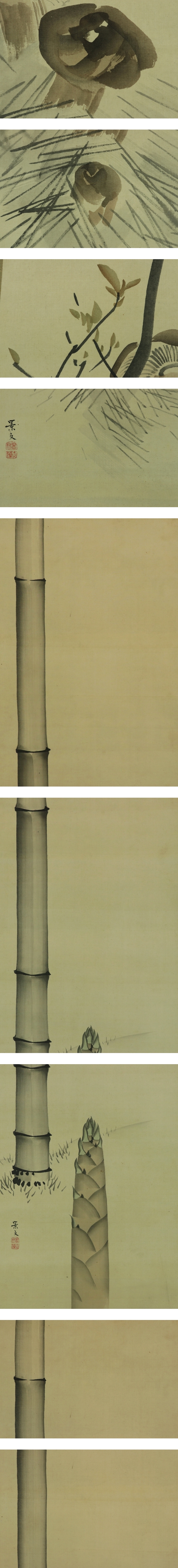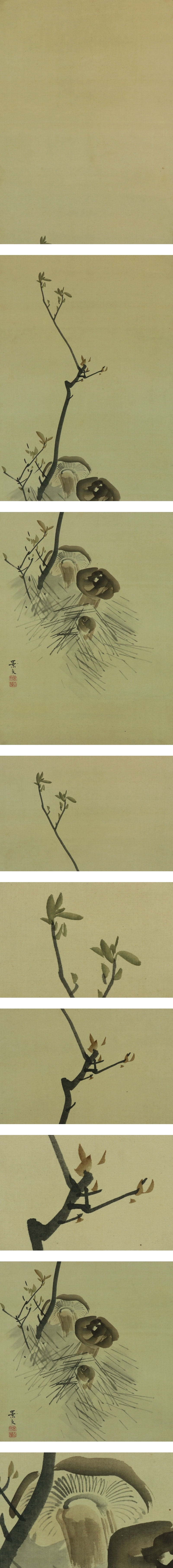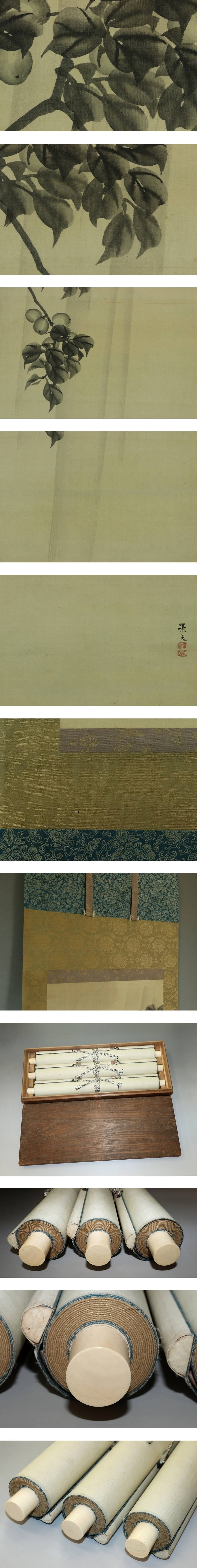 松村景文 まつむら-けいぶん(1779-1843) 江戸後期の四条派の画家。京都生。呉春の末弟。 通称は要人、幼名は直治、字は子藻、号は華渓。 兄より絵の指導を受け、また円山応挙の写生風を学び一家を成す。 天保14年(1843)歿、65才。 本紙は、染み、軽い皺、焼けがあります。 表装は、染み、汚れ、軽い皺があります。 【サイズ】 作品 横約33.5cm×縦約120cm 表装 横44.5cm×縦約206cm |