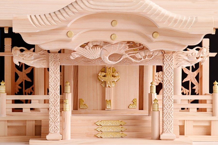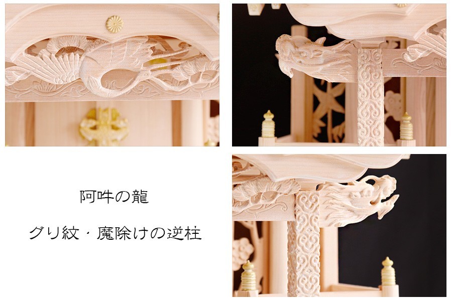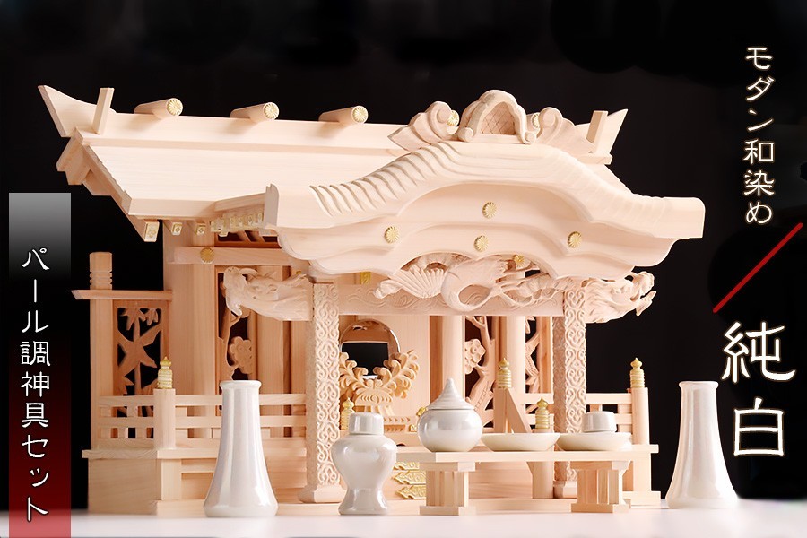 当店、好評を頂いております「昇龍大社/入母屋神棚」シリーズ。中でも家具職人が手塗りで仕上げた家具調仕上げのモダン神棚セットです。 細微な彫りで作られる透かし欄間、阿吽の昇り龍や舞鶴。塗料は亜麻仁油を原料とした自然素材。高級家具などに使用されるように木目の美しい文様を浮き上がらせます。 また経年による変色が目立たず、いつまでも木の風合いを損なわない効果もあります。「純白」色は本来の白木をさらに輝かせる仕上げ。お部屋が明るくなるような、さわやかなイメージです。年月を経ても白木の美しさを保つ特殊な塗装加工です。 付属の神具陶器は国内唯一の窯元で焼かれるパールカラー。硬質な銀白色に淡いレインボーの文様が浮かび上ががる特別な一式。八足台、神鏡の台座はお社本体と同色塗装が施されています。 横幅は59cmとやや大型の神棚となります。奥行きもありますので、一社としては豪華な逸品。お社の底面からお神札を簡単に収めることができます。また、横幅が広く、様々なお神札の形状に対応します。