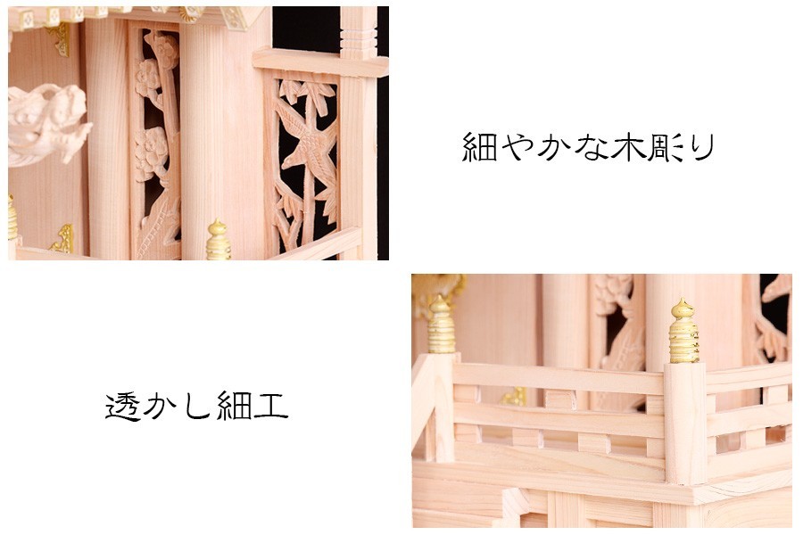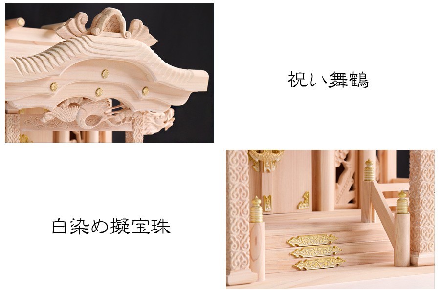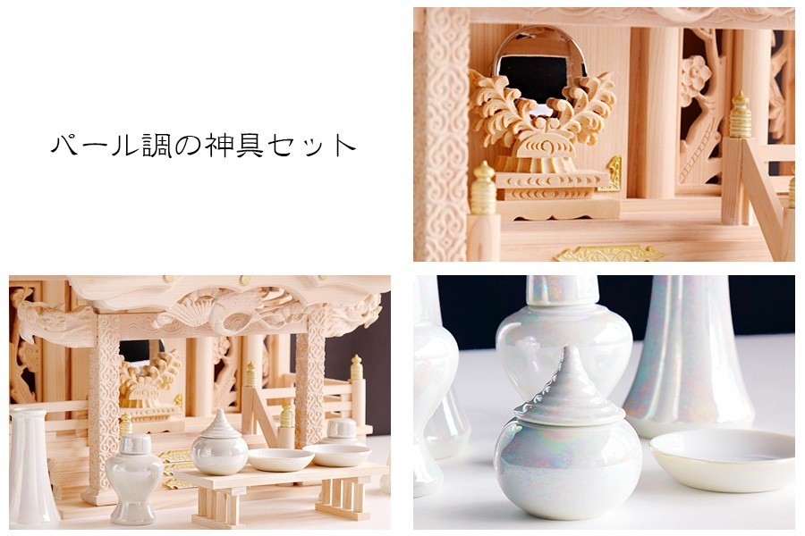 ・せともの陶器神具 (榊立てx2、平次x2、水玉、皿x2) ・彫り込み神鏡 2寸 (お社と同色塗装) ・八足台 (お社と同色塗装) ・シルク調造花榊一対 | |||||||