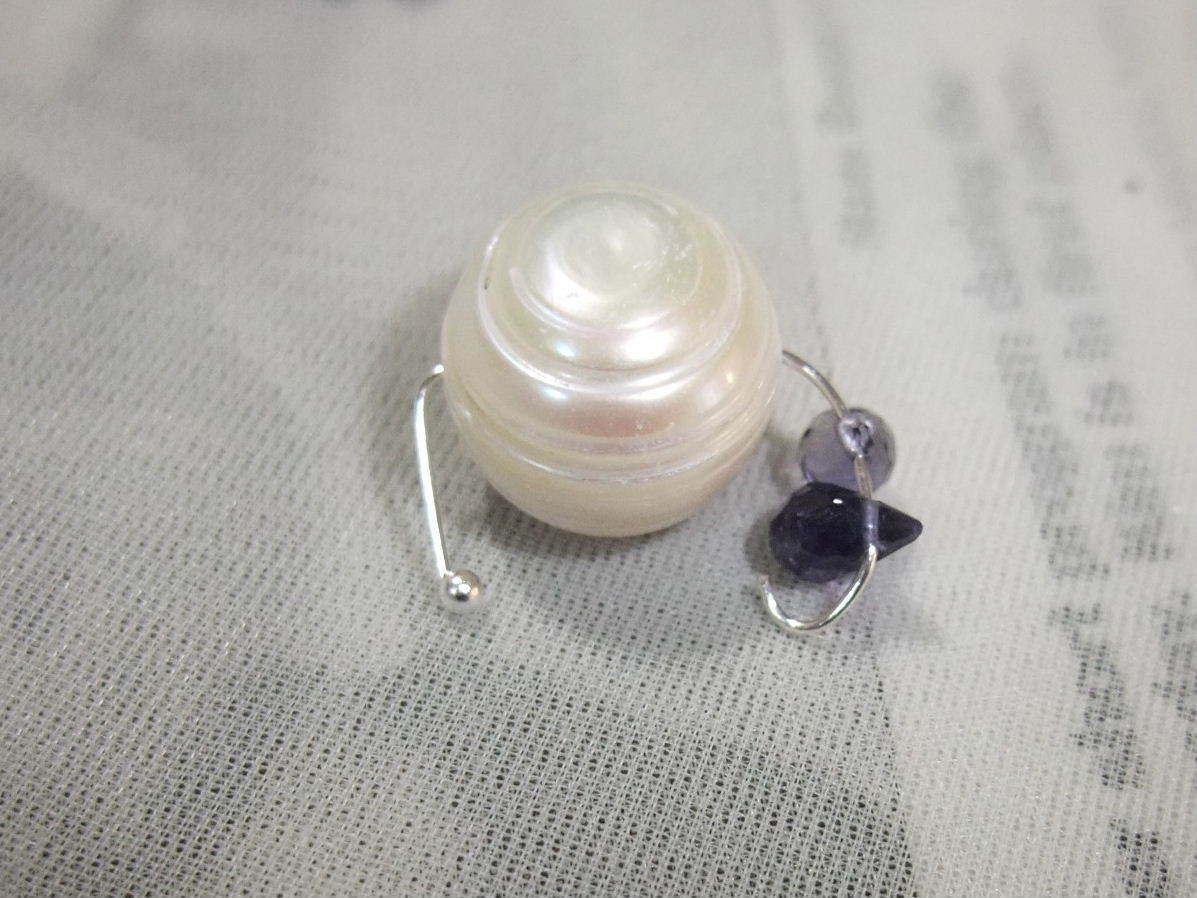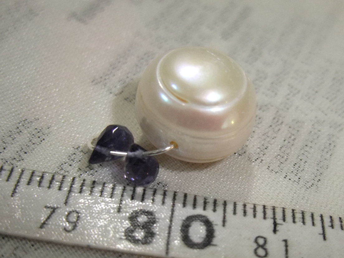 綺麗白真珠大粒とアイオライトブリオレット小粒大きめ穴セット☆高品質ルースの製作便利セット☆アイオライトカットの綺麗な小粒~のブリオレットのクレオパトラ両穴のルース☆穴が大きめで0.6mm弱のピンが通ります♪色合いもなかなかの美しい石綺麗なルース☆しずくドロップ型クレオパトラタイプ(上部の貫通穴横穴の両穴開き)と大粒真珠(南洋真珠のようなサークル痕の淡水真珠)☆両穴ルース☆ イヤリングやピアスに一番お薦めですが、ブレスレットやチョーカーのポイント、コスチュームジュエリーのお直しやリメイクなどにも便利なルースです☆