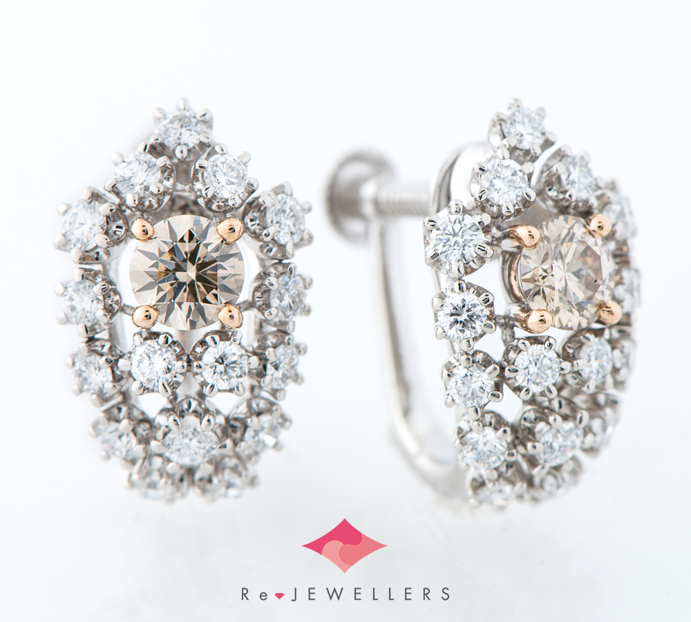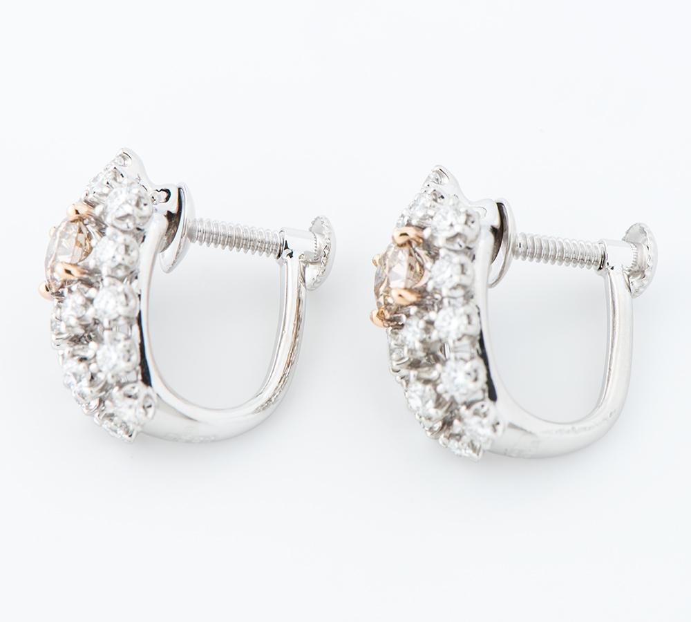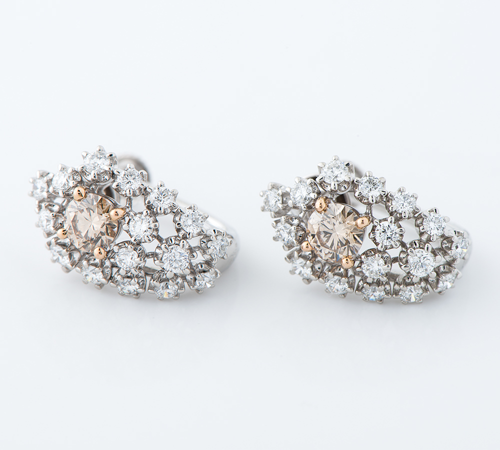 柔らかな色合いのブラウンダイヤモンド計0.60ctの眩い煌めきに目を奪われる、カシケイのイヤリング。計0.85ctの美しいメレダイヤモンドを取り巻きに、メインストーンとしての存在感を存分に感じるシャープな輝きと豊かなファイアが魅力的です。耳元に沿った柔らかなアーチを描いたシンプルデザインは、品格を感じる洗練された雰囲気。世代を問わず楽しむことのできる、エレガントなジュエリーです。