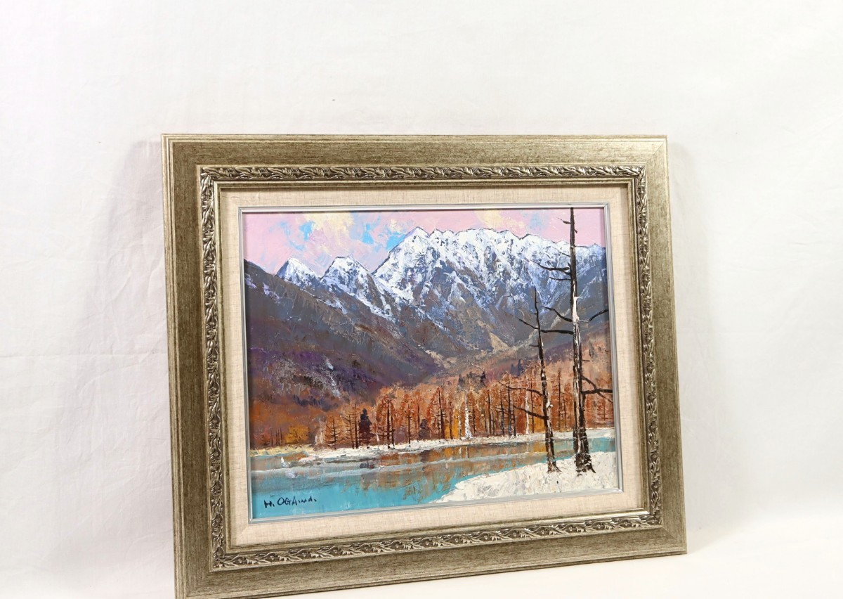 真作 小川博 油彩「大正池」画寸F6 東京都出身 一水会会員 新世紀会員 雪を湛えた穂高連峰と大正池の静かな湖面に映る枯れ木群の倒影 7411