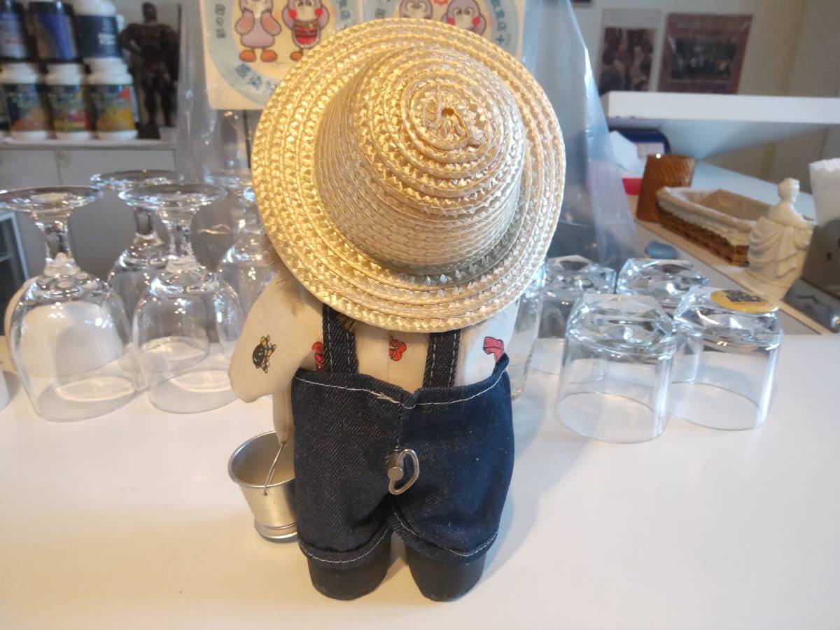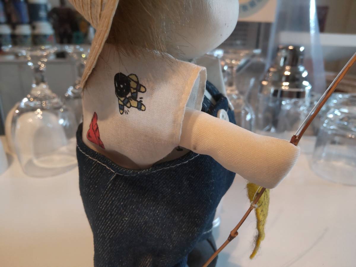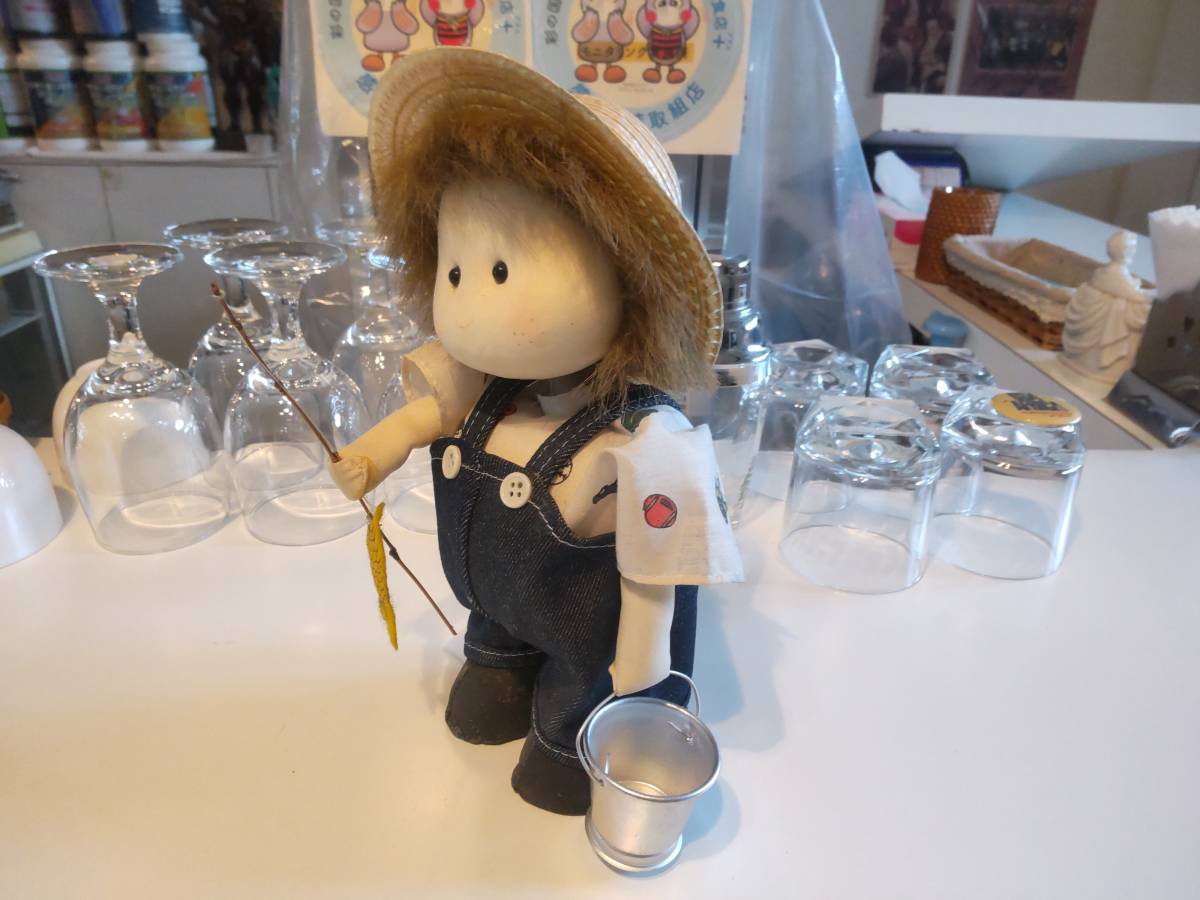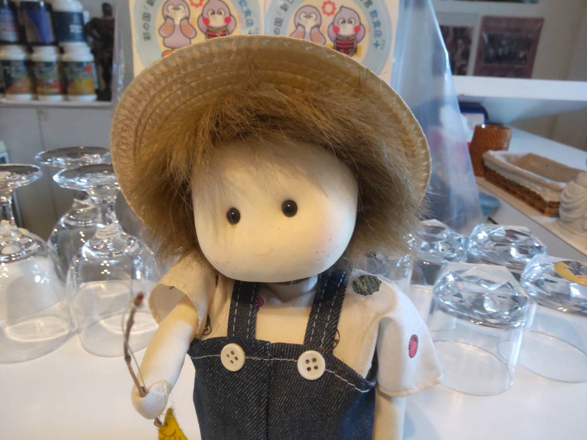 昭和レトロ★日本製★80年代★当時物 少年 少女 魚釣り オルゴール付き 人形 ぬいぐるみ★フィッシング 釣竿 オーバーオール 麦わら帽子