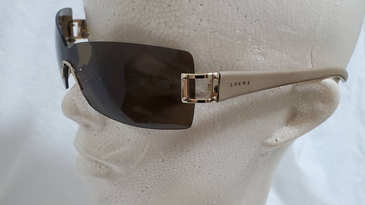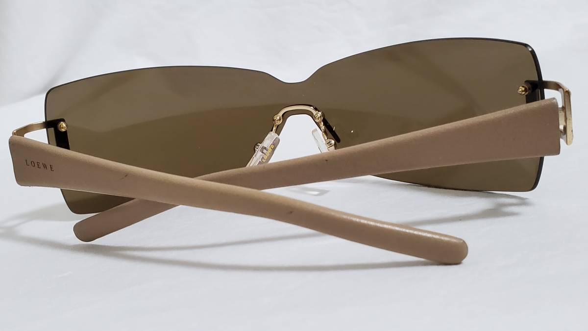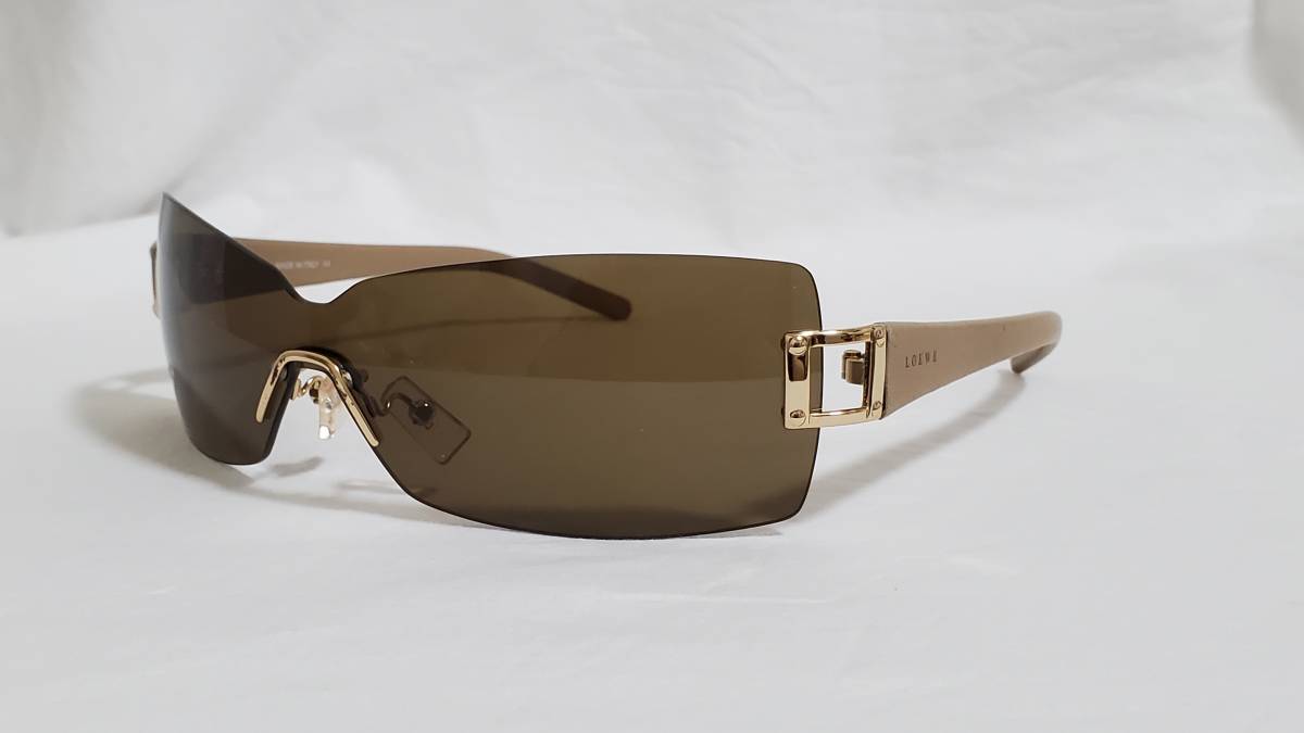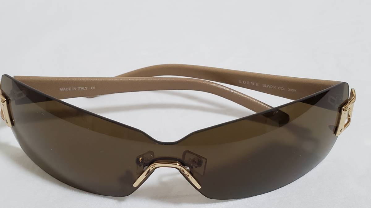 正規良 レア LOEWEロエベ アマソナ エンブレムロゴ メタル装飾 シールドレンズサングラス 茶系 レザーコンビフレームアイウェア〇男女兼用
