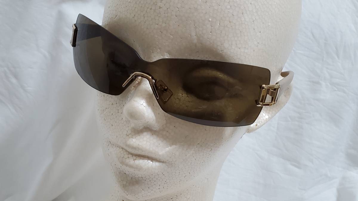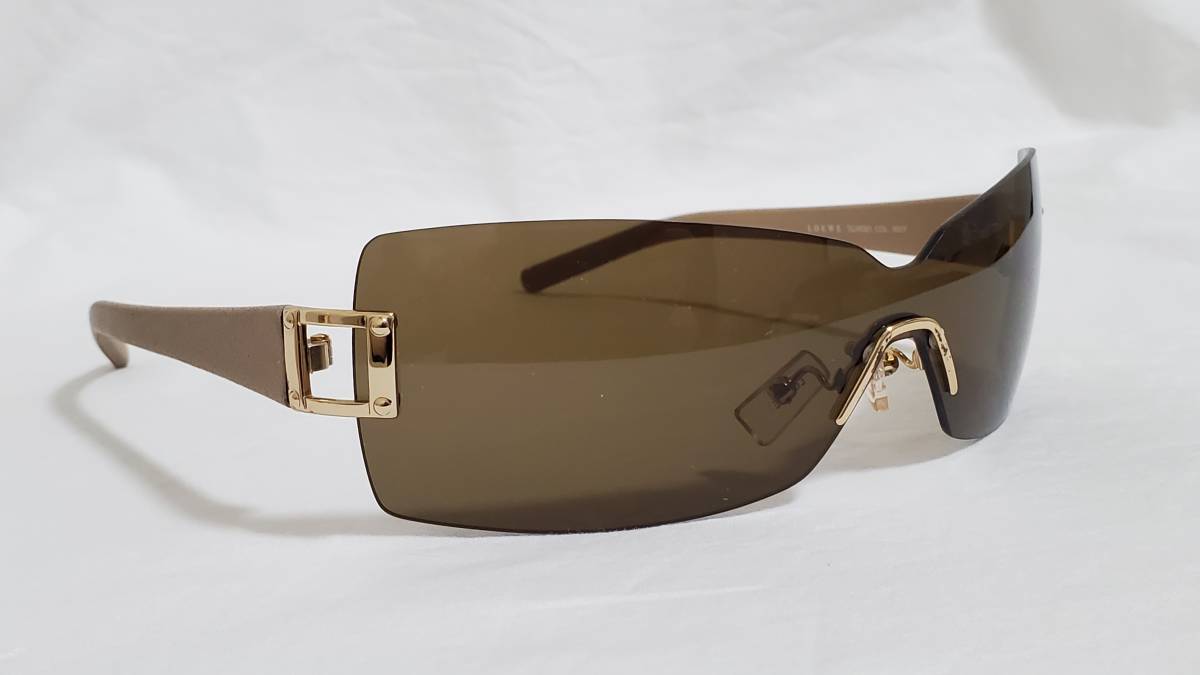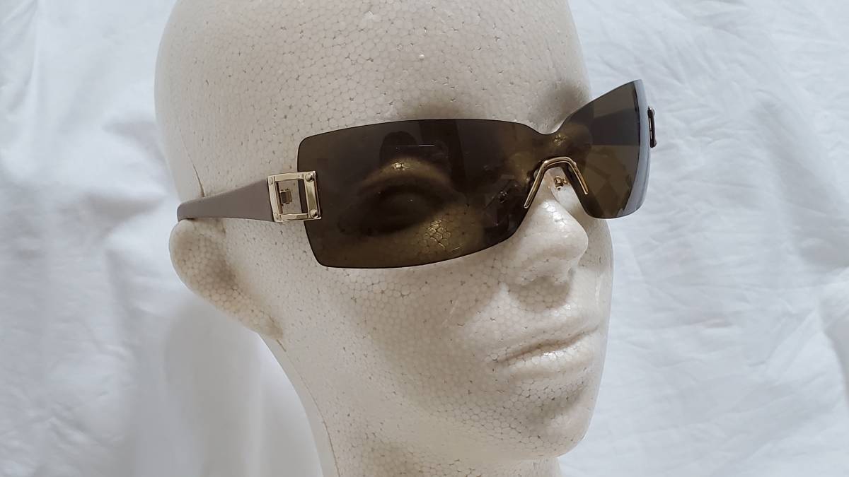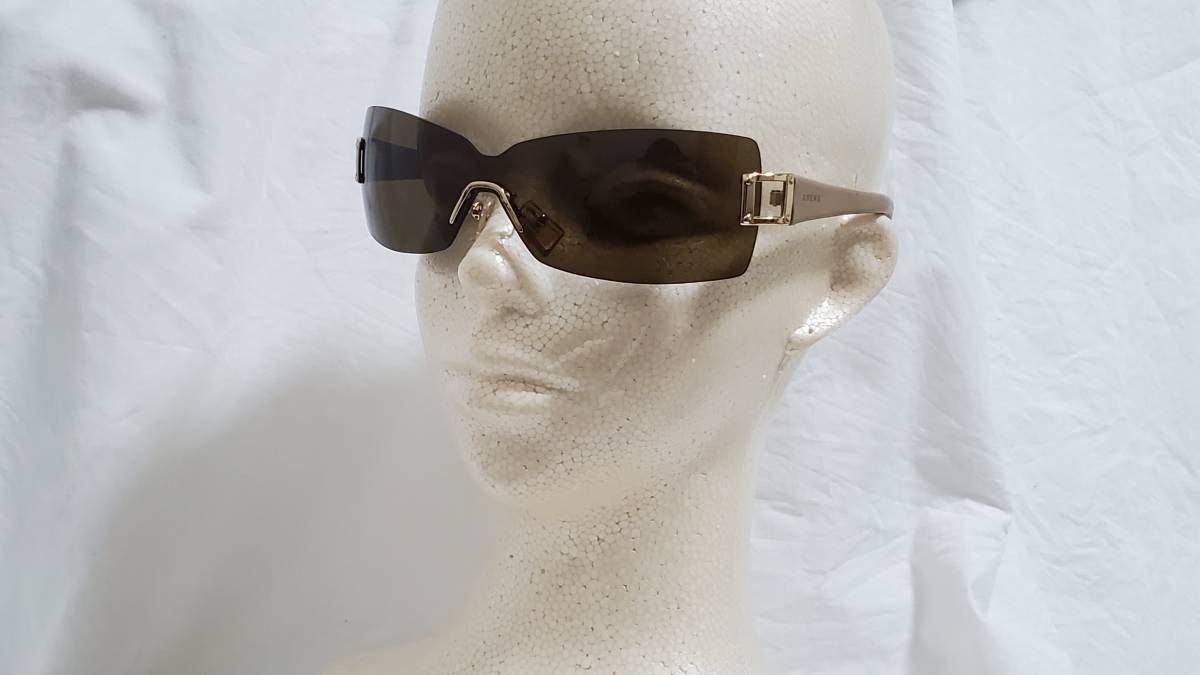 正規良 レア LOEWEロエベ アマソナ エンブレムロゴ メタル装飾 シールドレンズサングラス 茶系 レザーコンビフレームアイウェア〇男女兼用