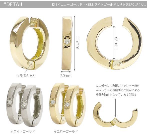 商品コード m14080104wg 発送は2週間ほどですまるでピアスをしているように見えるイヤリングピアスホール(穴)を開けるのはイヤだな、ネジ式イヤリングはめんどうだなという方におススメです中折れ式ピアスは構造上、長く使用して開閉を繰り返している間にゆるんでしまい耳たぶを挟む力が弱くなって落としてしまう…なんてこともあります当店ではこの中折れ部分に、ゆるみを軽減する特殊構造(特許 第5461456号取得)を考案して改善いたしましたワンタッチで装着が出来て忙しい女性にぴったりなフィットリングお洒落を気軽に、手早く長く楽しみましょう♪■商品詳細材質 k18ホワイトゴールドまたはK18イエローゴールド宝石名 天然ダイヤモンド トータル0.02ct大きさ 最大幅 タテ 約11.2mm 幅約2mm備考 材質の刻印入りm-1062お誕生日 プレゼント 結婚記念日 クリスマス プレゼント ホワイトデー 結婚式 卒業式 入学式 新生活 母の日 成人のお祝い 彼女 恋人 女性への贈り物 ギフト対応 送料無料普段使い 日常使い デイリー カジュアル アクセサリー レディース 自分へのご褒美 新作 浴衣に似合う ボーナスセール 夏 ポイント消化 安い