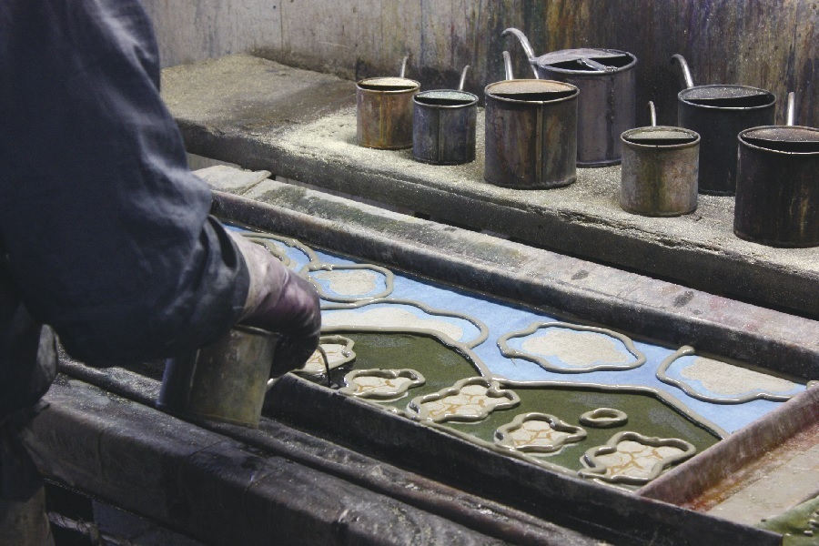 染料を注ぎ、模様部分を染め上げる伝統的な型染めの一種です。