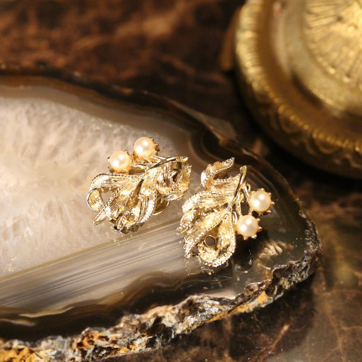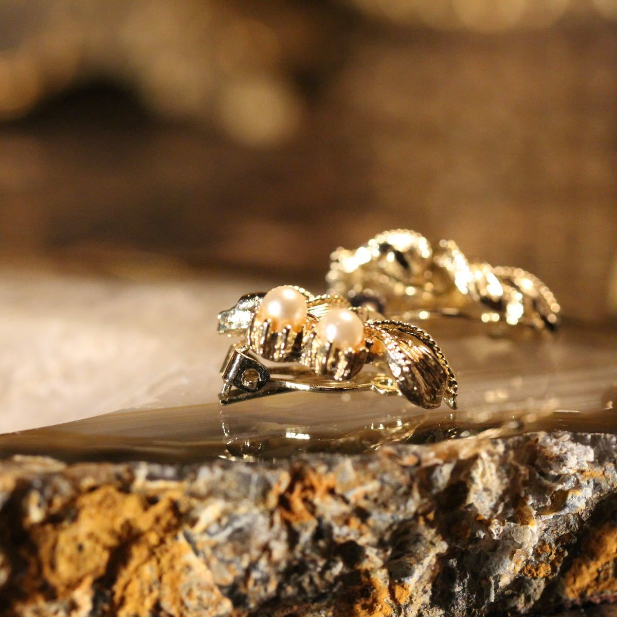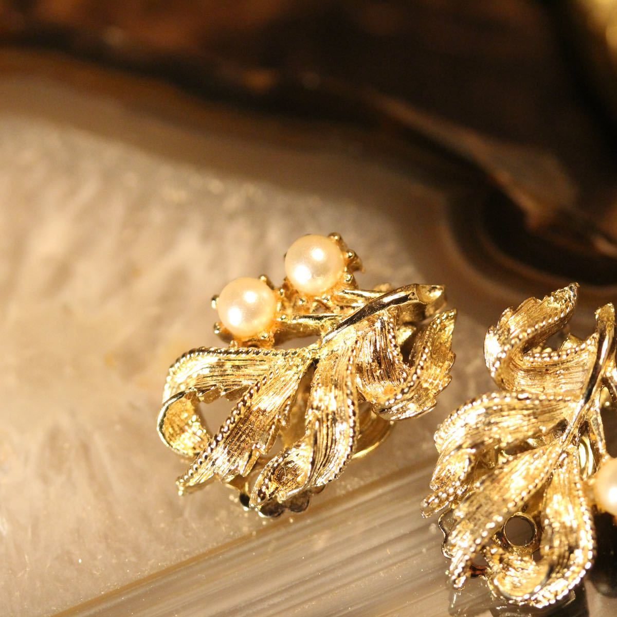 USA VINTAGE PEARL STONE LEAF DESIGN EAR CLIPS/アメリカ古着パールストーン葉っぱデザインイヤリング