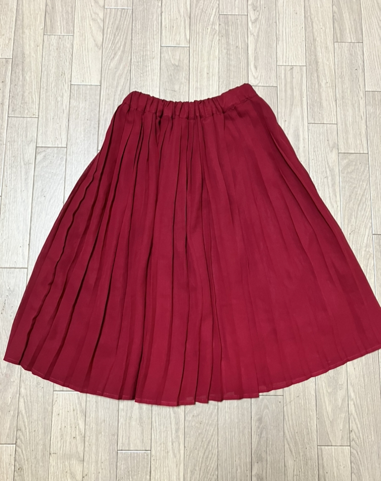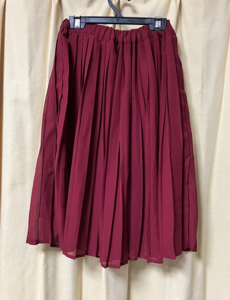 落ち着いたえんじ色のスカートで、合わせやすく着回しも効きます。