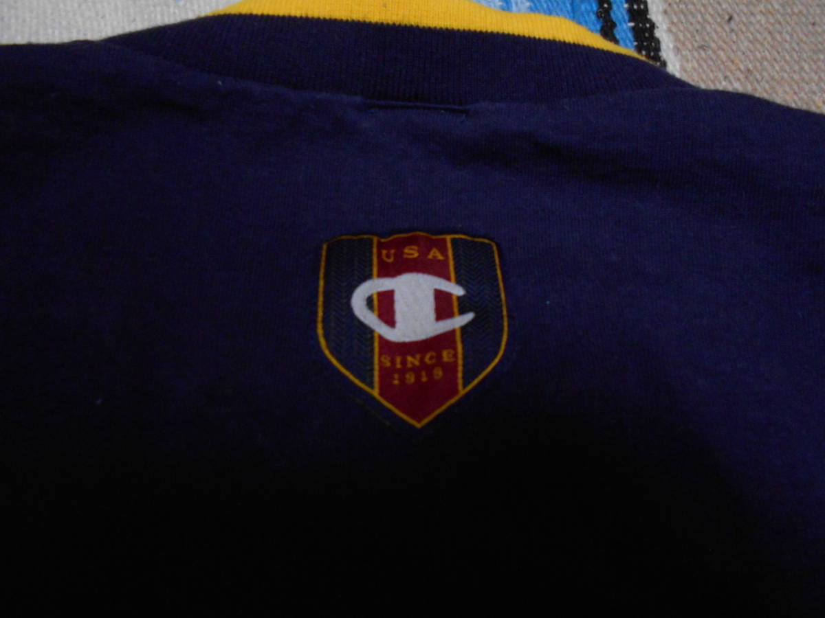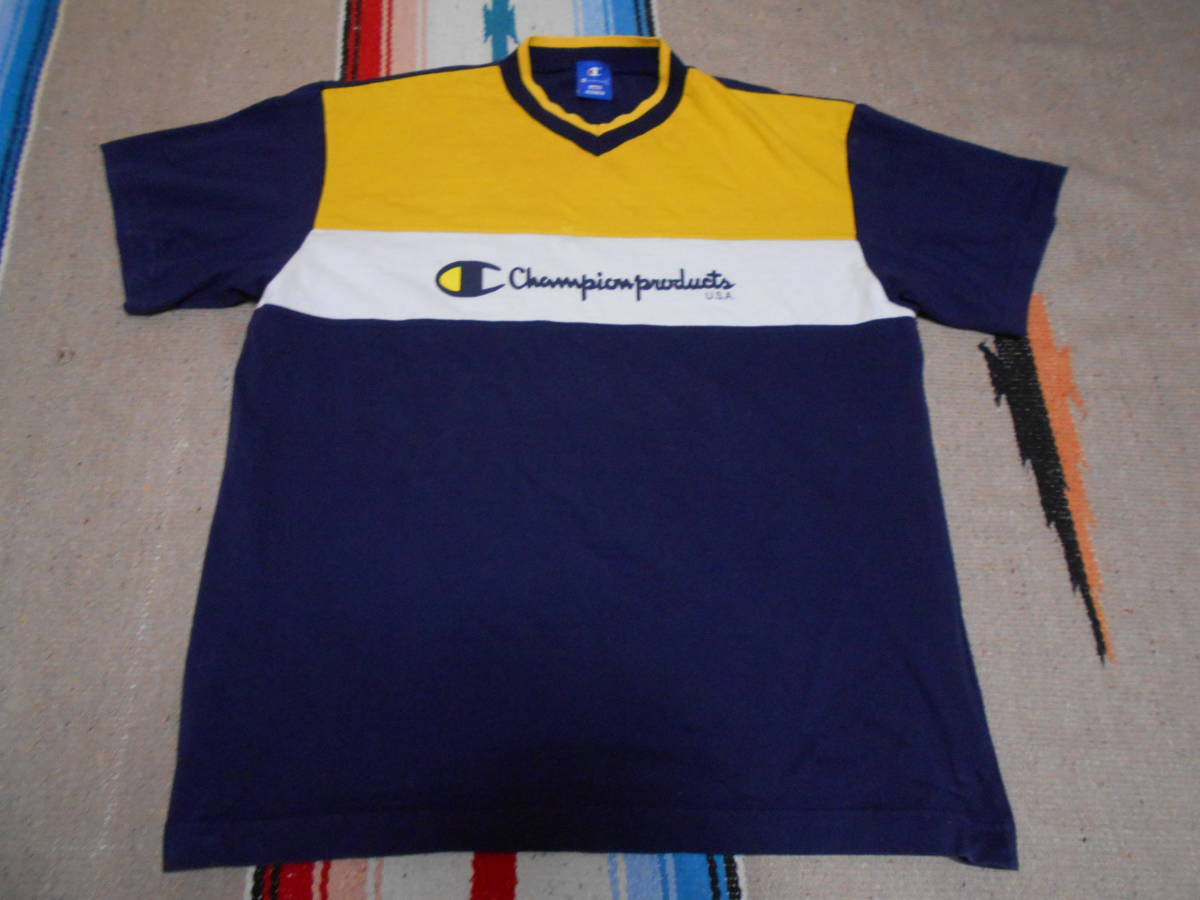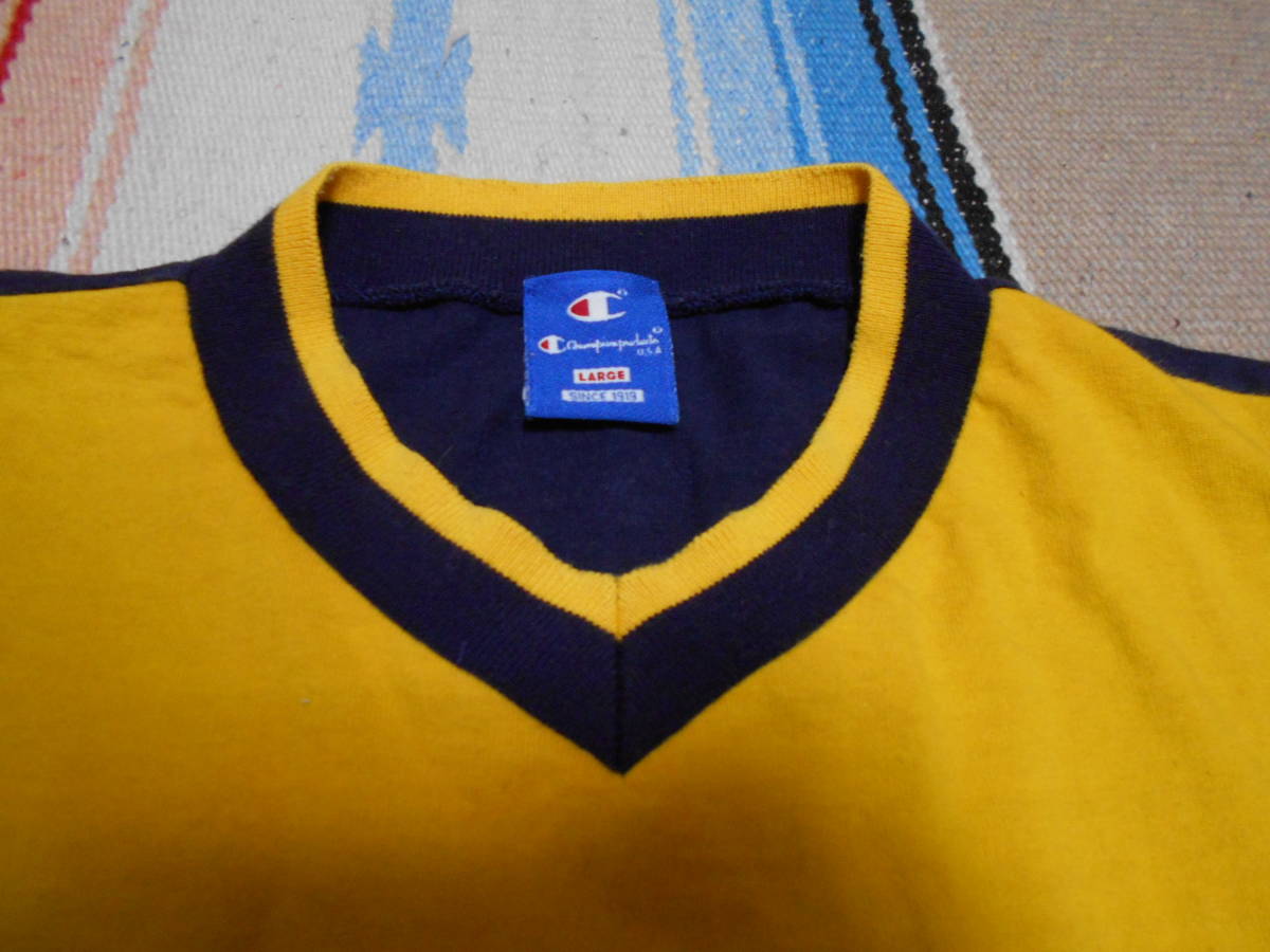 1990S CHAMPION GOLDWIN特有、良質コットン100%素材感、リブ素材縫い付けのタイトVネック、ルーズ過ぎないシルエット、バックネックの CHAMPION USA エンブレム、チェスト切り替えしカラー、CHAMPION クラシックアスレティックロゴ  等等... ディテールまで極めて良いテイスト