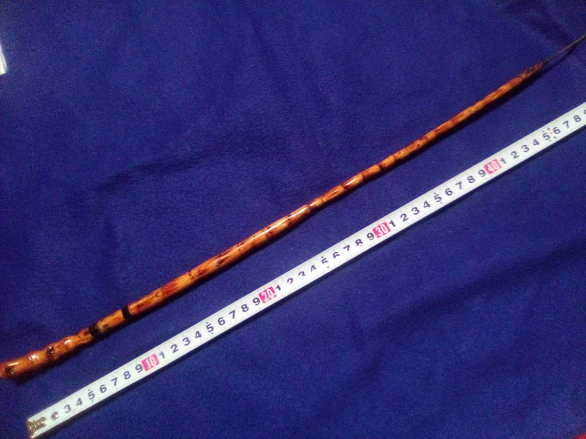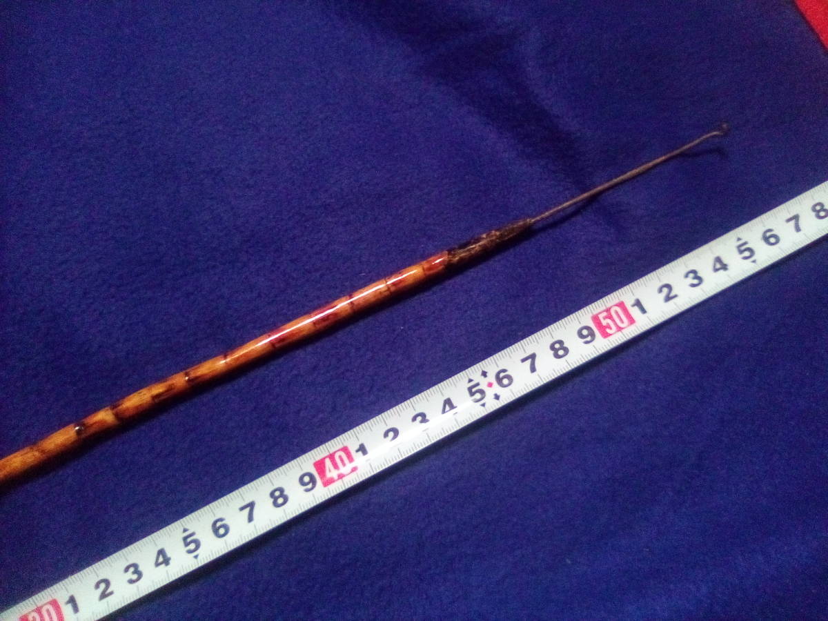 【一言二言】ここ数年はヘら鮒が大型化して当地菊池川の近年のヘら鮒釣りは尺二寸はジャミと言われる程に大型化して繊細な釣りとは無縁となりました。竿は10尺前後で道糸2号ハリス1号ハリ10号の仕掛けで豪快にひきよせて大きな丸型の金具のハリ外しでサッと外すのが主流の野釣りには、ハリ外しは本当に重宝します。お気に召しましたらご入札よろしくお願いします。素材の矢竹は阿蘇山の南の原野にて毎年お弟子さん達と真冬の雪の中で採取した希少なものです。デッカイ猪が出没しますが、そんな時は愛弟子の矢住二天のショットガンが火を吹きます。可愛いバンビちゃんの姿も、でも猟師は、コレも血祭りにします。ワイルドライフイン南阿蘇怖いですねでも楽しいですよ!
