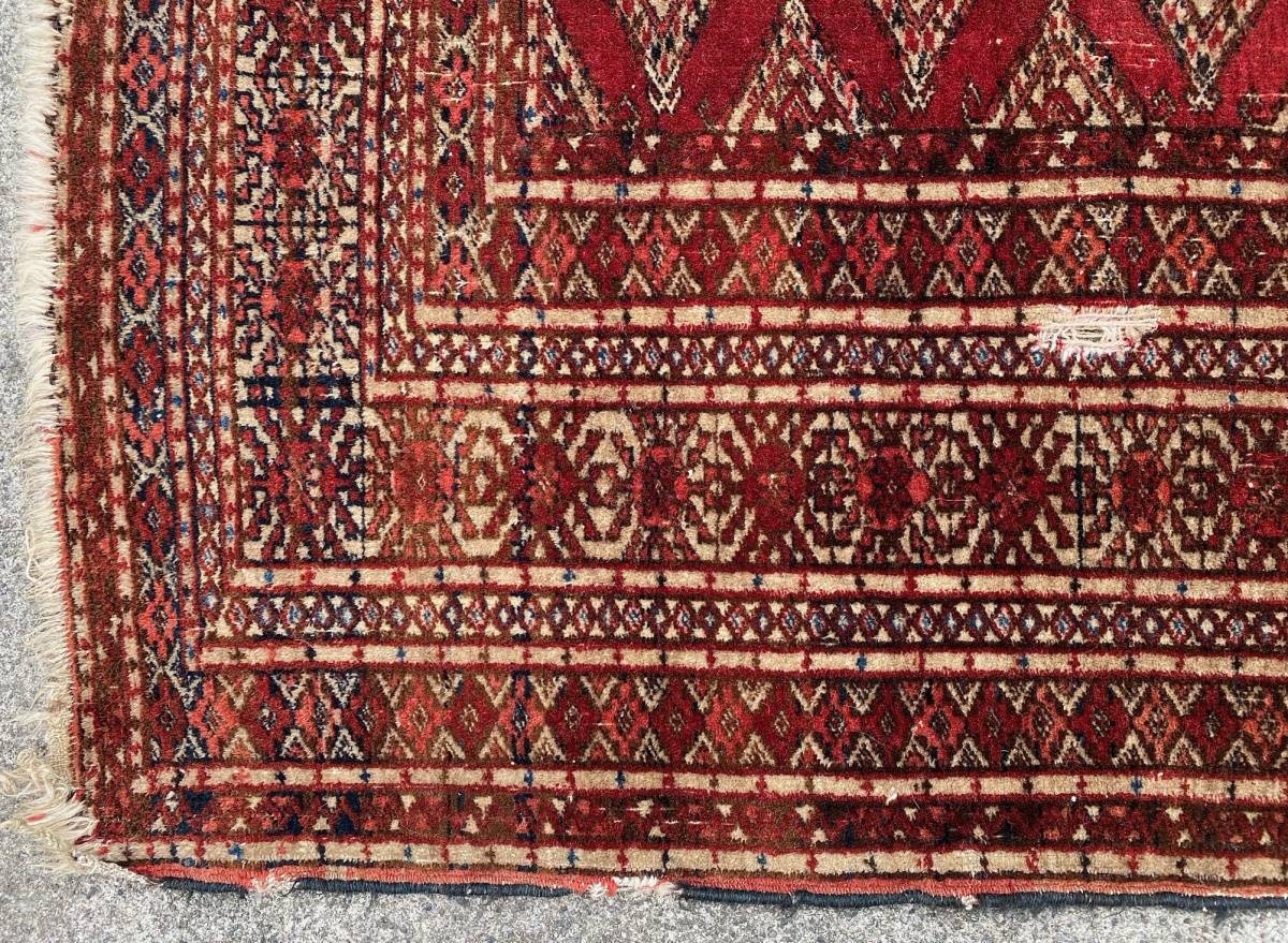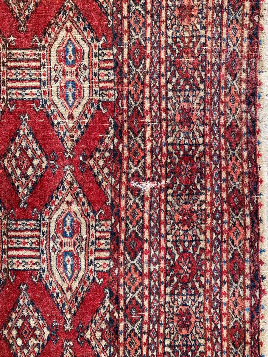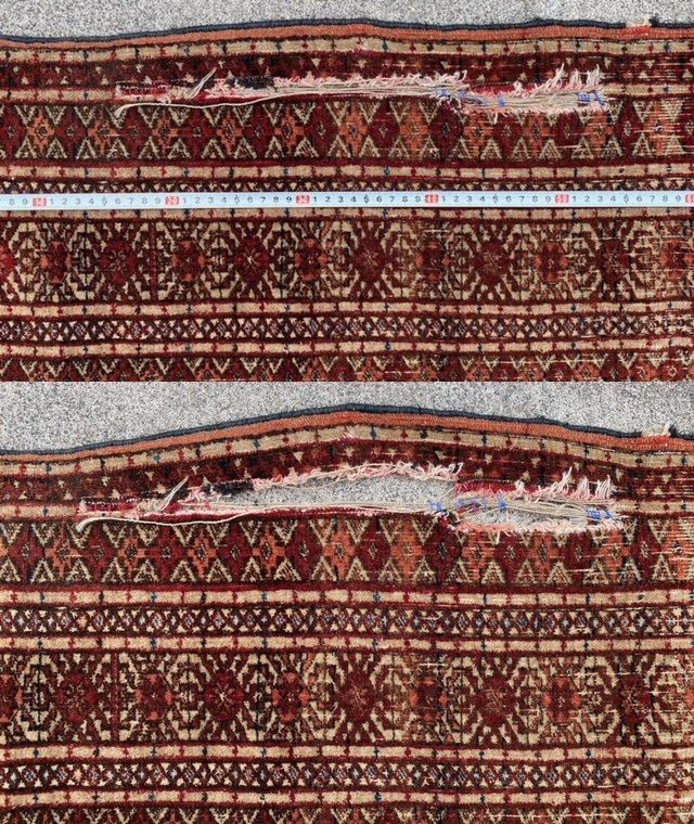 | 商品説明 | ご覧いただきまして誠にありがとうございます。 ※※※お手数をおかけしますが■商品説明、画像■注意事項■発送詳細■自己紹介を必ず最後までお読みいただいたきまして、ご理解ご納得いただいた上での入札をお願いいたします。よくお考えになられてからの入札をお願いいたします。入札されました時点でご理解ご納得いただけたものと判断させていただきます。 ※※※ 当方の扱う品物は古い物・中古品、錆びた物が多くなりますので、少しでも細かい点など気になる方、中古品、古い物にご理解のない方、状態を過度に気にされる神経質な方には不向きです。入札はお控えください。古い物に理解のある、心にゆとりのある方向けのお品です。 年月を経過している為、中古品の古い物はもちろん、仮に未使用品であったとしてもキズ、汚れがある場合がございますので中古品として出品しております。 ※ご不明な点、ご要望等(対応できないかもしれませんが)がございましたら必ず入札される前に遠慮なくお問い合わせ下さい。落札後に色々と要望される方がいらっしゃいますが困ります。 質問に気がつかない事がございますので回答がない場合はお手数ですがもう一度お願いいたします。 ※(出品者への質問)からの値下げ交渉はご遠慮くださいませ(複数買うので値下げ希望という方もいらっしゃいますが一切対応しておりません)。※ ■落札後の挨拶等のお気使いは無用です。どうぞお気軽にお取り引きくださいませ。 -------------------------------------------------------------------- ■商品説明■ アメリカで使われていたアンティーク ラグ です。産地は西アジア近辺(推定)。推定~1930年代頃の物だと思います。長年使い込まれた凄みのある風合いです。大変古い物になりますので現状渡しが前提のお取引となります(ダメージの無い物をお求めの方、細かな状態が気になる方には完全に不向きなお品です。※ご注意ください)。 穴、破れ、裂けと補修箇所があります。許容いただける方へ。 ■実寸((フリンジ状の部分を除く。※測り方、測る位置等の違いにより計測値に容易に差が出ます。およその数値とお考えください。計測値に関するクレームはお受けできません。ご心配な方は入札をお控えください。※古いラグの多くがそうだと思いますが、正確な長方形ではありませんので対辺の長さはそれぞれ異なります(4辺全て長さが違います)。 約186cm x 約131cm程 ■状態 :※現状渡しとさせていただきます(※ダメージの無い物をお求めの方、細かな状態が気になる方には不向きなお品です。※ご注意ください)。※出品物のような状態のラグをあえてお探しの方、好きな方、各ダメージも「味」としてご理解いただける方向けのお品です。細かな状態が気になる方には完全に不向きなお品です。ご注意ください。 穴、破れ、裂けと補修箇所があります。 4辺各部にほつれ、破れ、裂け、穴、スレ、擦り切れ、薄くなった部分、抜けたウール繊維の付着、パイルが抜けやすい部分、汚れ、糸補修、塗料?の付着 等。入手後に洗浄、掃除機、ブラシがけによる抜けたウール繊維等の付着物の除去を素人なりに念入りに行いましたが完全ではありません。残りは落札者様の方でお願いいたします。見落としはご容赦くださいませ。 ※現物の色が画像にうまく出ておりません。現物の色や状態が画像にうまく出ないことがございます。色褪せ、ヤケ、黄ばみ等は特に画像に出にくいです。画像は素人が撮影しております。ご覧になっているPCのモニタやスマホ等の画面と現物の色味が異なる場合や現物よりきれいに状態良く写ってしまうことがございますが予めご了承下さいませ。 状態について過度に神経質な方には不向きです。汚れやダメージ箇所の全てを画像に載せたり説明することは困難です。画像や状態説明では確認できない汚れ、ダメージ、補修 等があるかもしれませんことを、画像と現物の色味に差がありますことを予めご理解ご了承いただいた上での入札をお願いいたします。クレームや返品・返金・交換等はお受けできません。不安な方は申し訳ございませんが入札はお控えくださいますようお願いいたします。 ご不明な点、ご要望等(対応できないかもしれませんが)がありましたら入札前にお問い合わせくださいませ。 | |