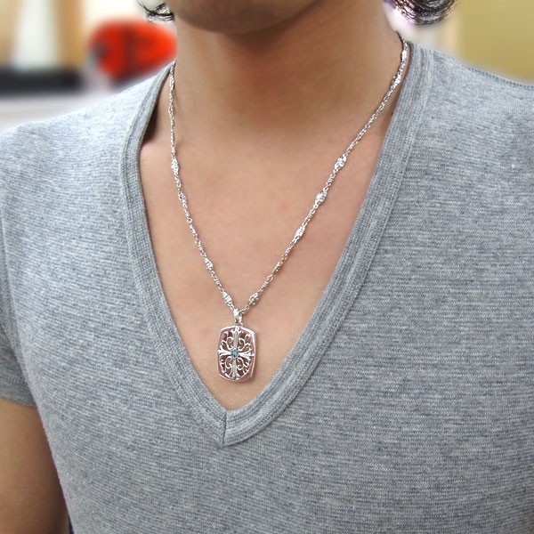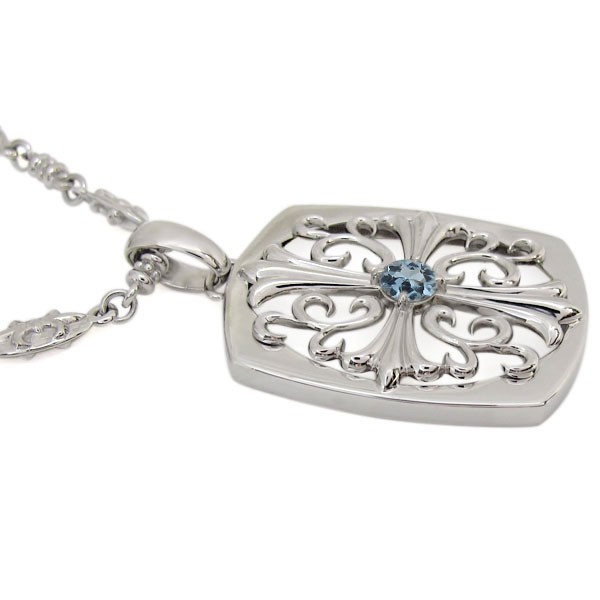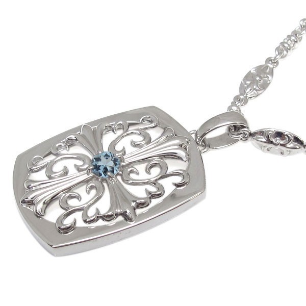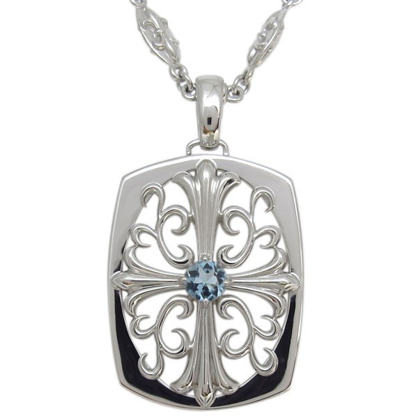 3月誕生石アクアマリンサンタマリアを使用したシルバー製の、クロス&アラベスク(唐草)デザインメンズ・ネックレスペンダントです。