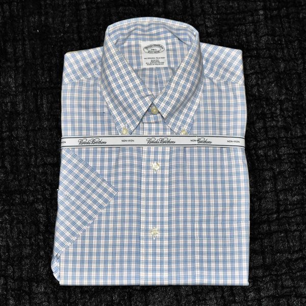 ★新品★ブルックスブラザーズ★お洒落な白にブルー赤のチェック、着心地良いコットンの半袖ボタンダウンシャツ14 1/2 SM