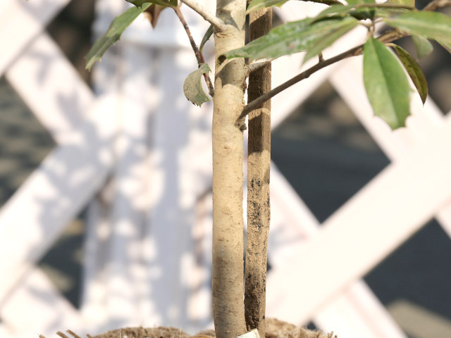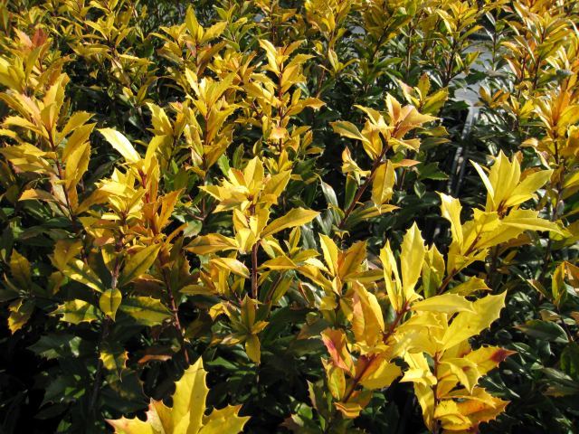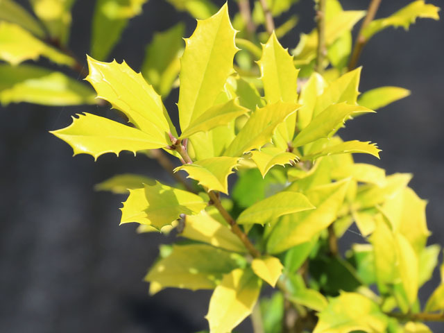 サニーフォスターは黄金色が美しい西洋ヒイラギです。春の新芽が黄色くなり、夏は緑になり、秋から冬にかけてまた黄色になります。葉には小さなトゲがあります。萌芽力が強く刈り込みにも耐えますので生垣に使用できます。