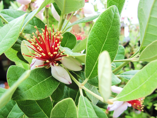 フェイジョアは常緑低木です。3m程度になります。南米原産です。秋にバナナとパイナップルの中間のような味がする緑色の実がなります。夏に4cmほどの赤い花がつきます。葉は卵型で表が深緑色で裏が白いです。熱帯の植物ですが耐寒性があり-10℃まで耐えます。果物として栽培されるほか、害虫に強く樹形が整うことから庭木や生垣としても人気があります。