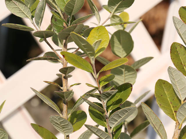 フェイジョアは葉のコントラストが綺麗な品種です。実は果物として取り扱われますが環境が合わないと結実しにくいです。