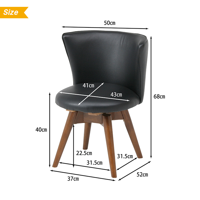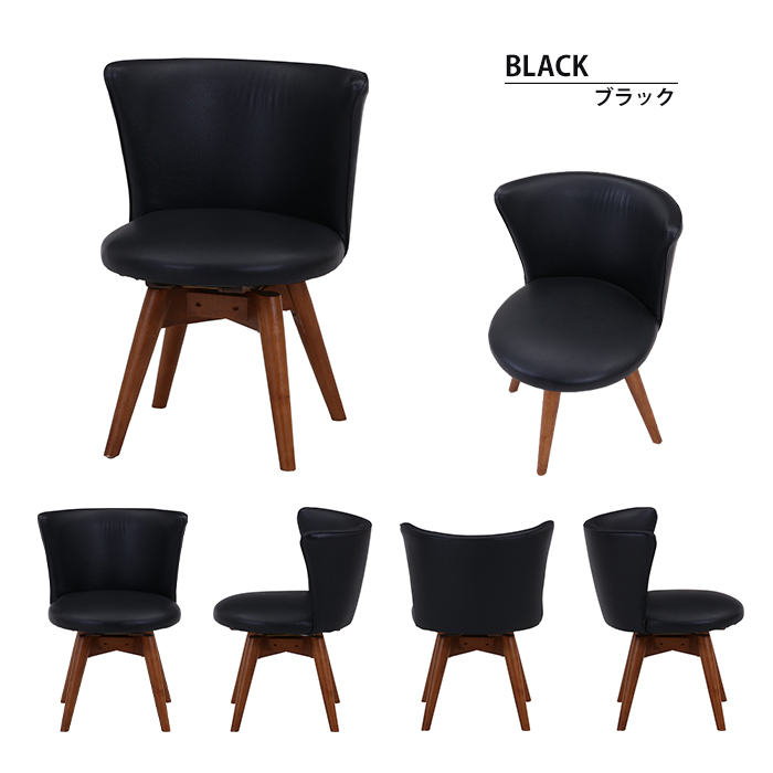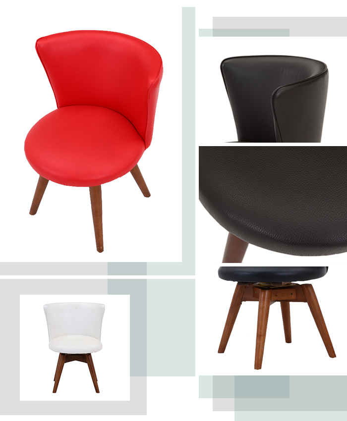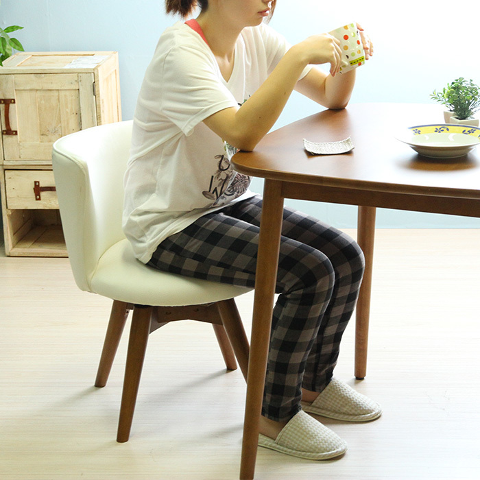 | 包み込むような座り心地のダイニングチェアです。 座面は立ち上がりに便利な360度回転式。 合成皮革なのでお手入れもラクラク。 |