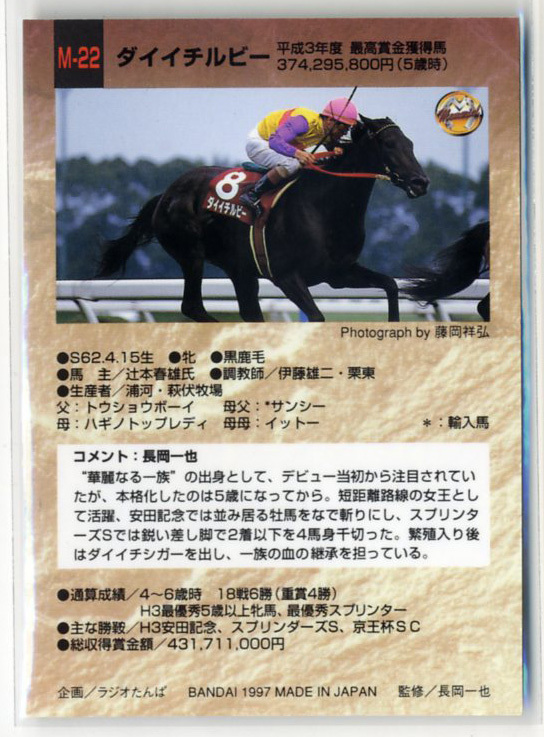 | ★ダイイチルビー M22 メモリアルカード バンダイ サラブレッドカード 97年上半期版 河内洋 安田記念馬 スプリンターズS馬 華麗なる一族 写真 画像 競馬カード 即決 | |