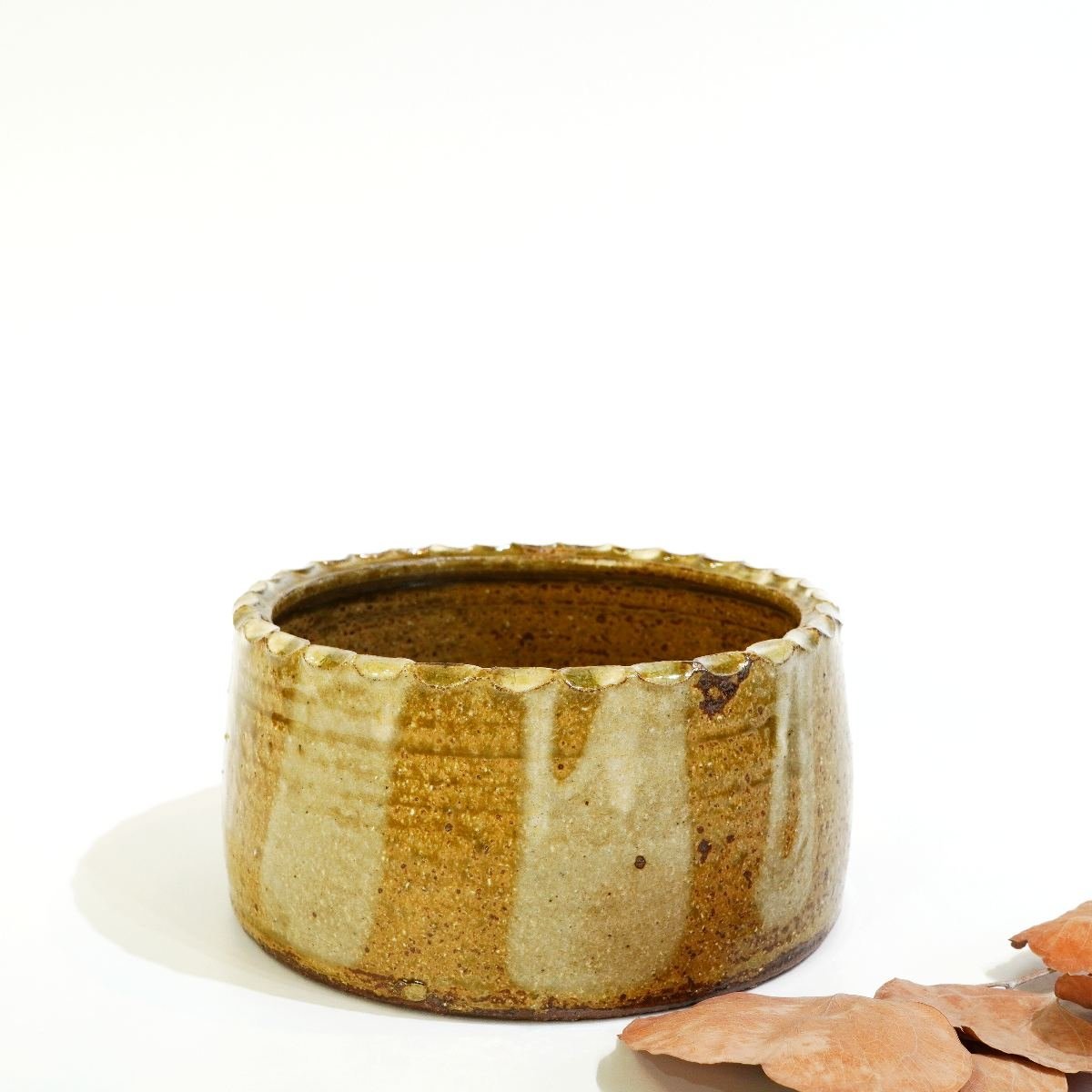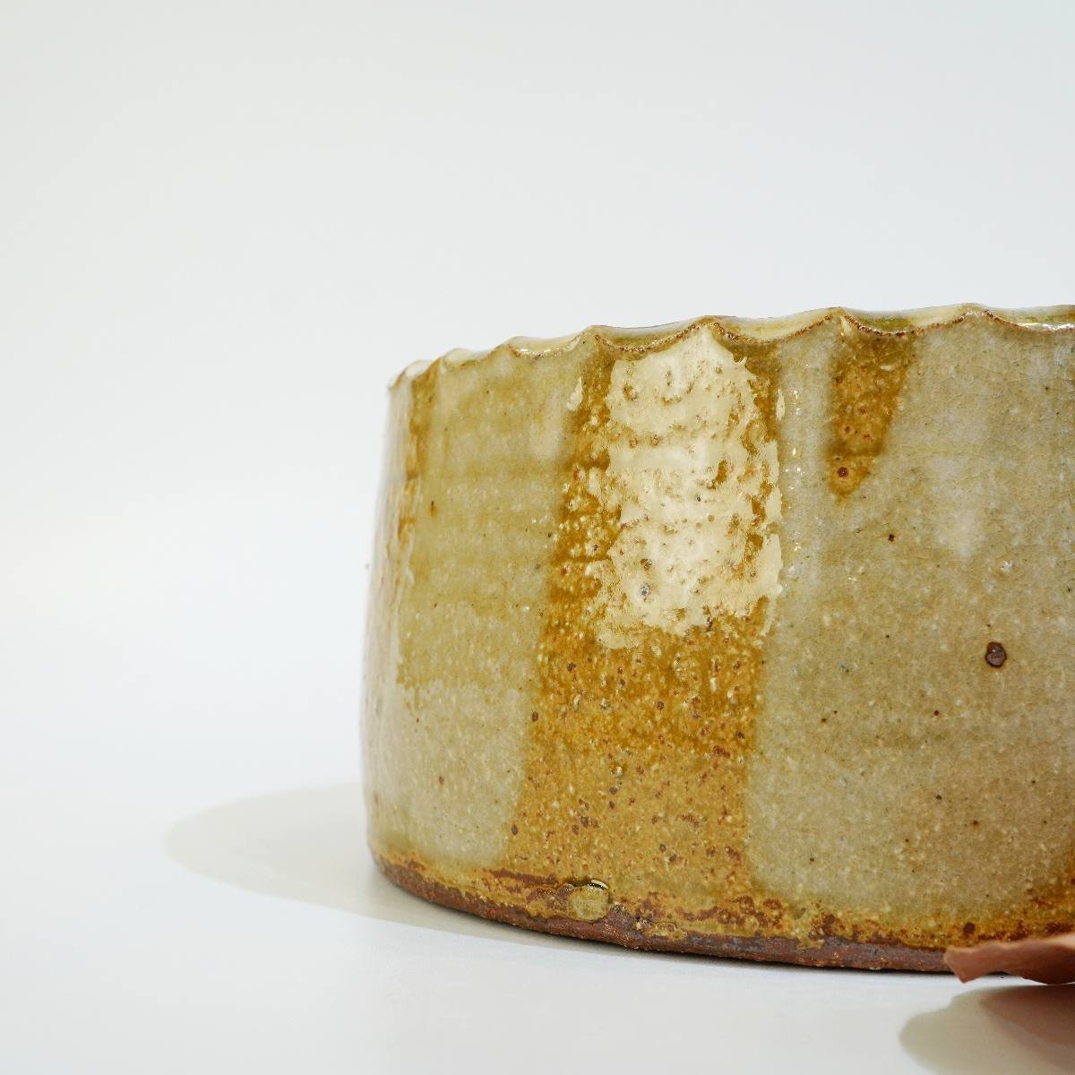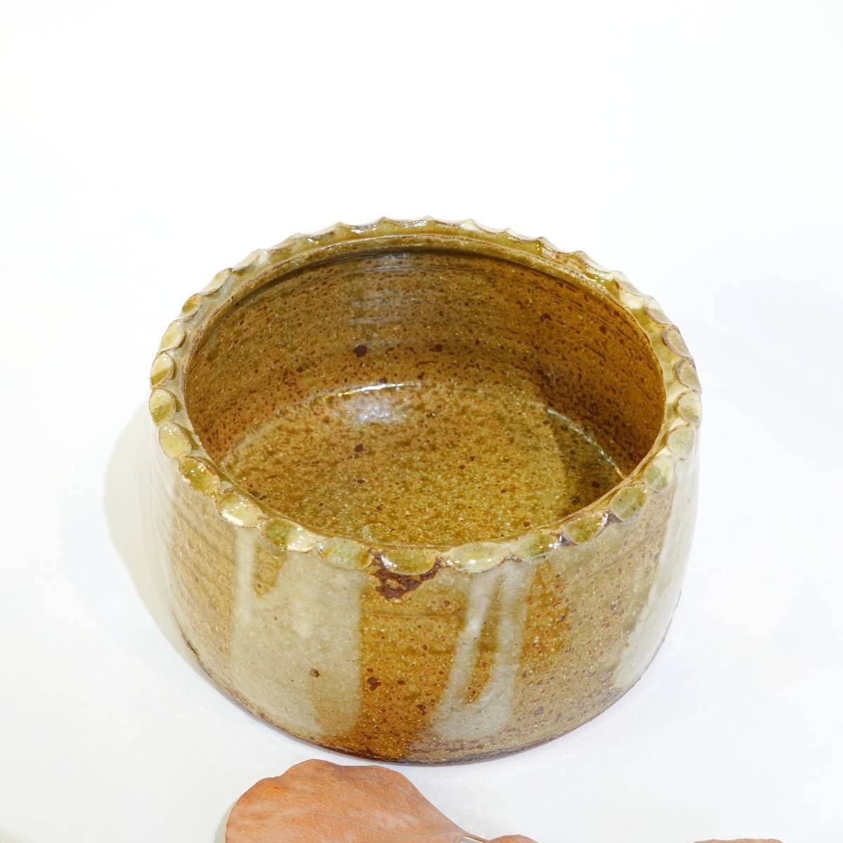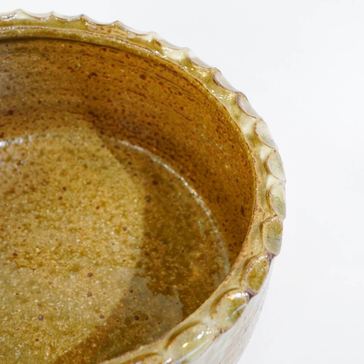 土を感じるザラザラ感、ごつごつとした感触を手で触って楽しむ。 さらに、縁に鋲打ちのように施された技や釉薬の流れを楽しむ。まさに、琴線に触れる一品です。