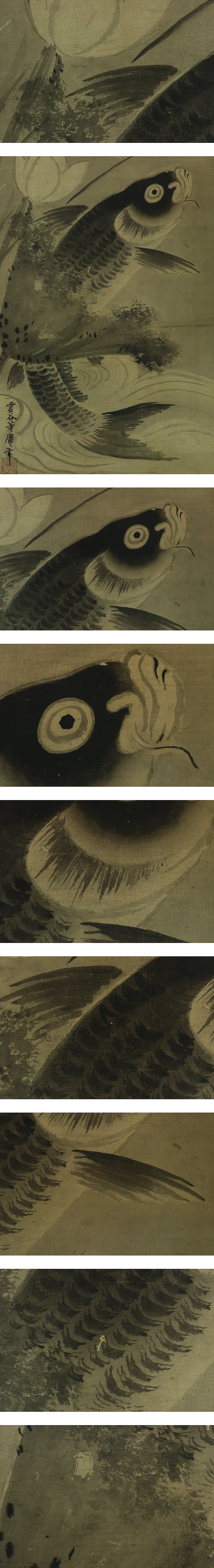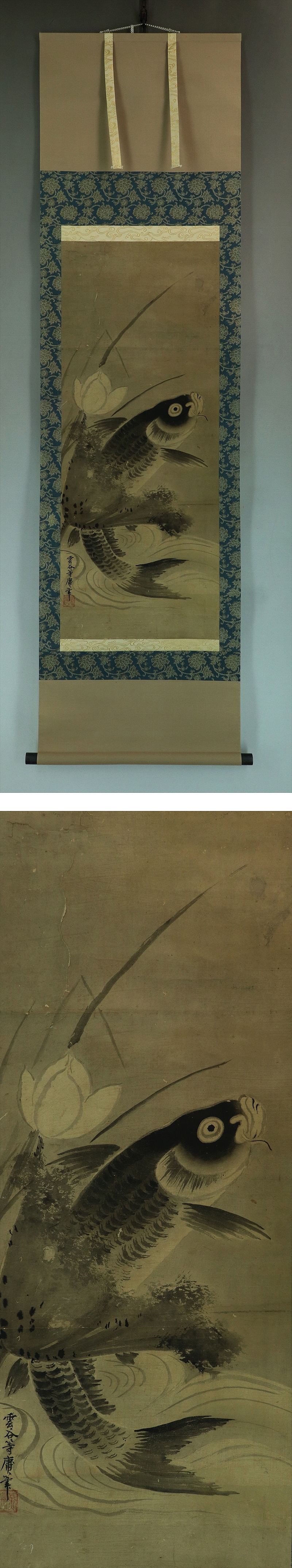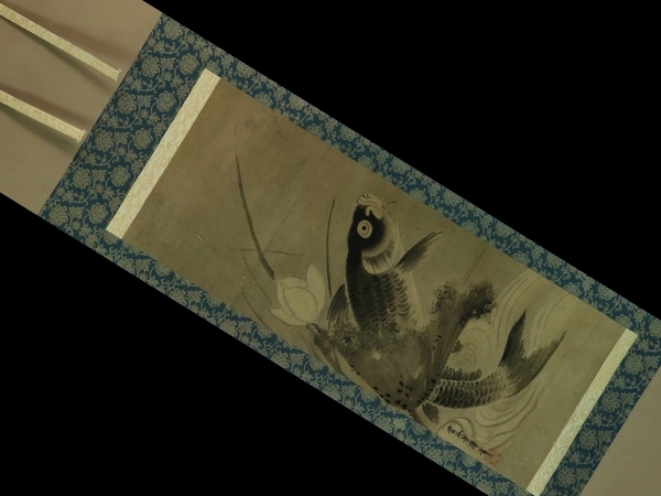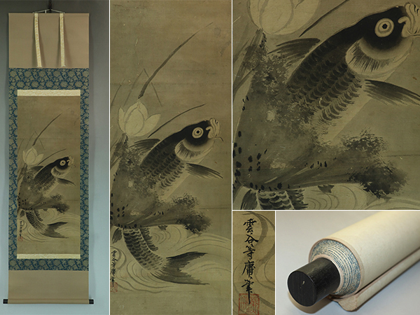 | №2211011【肉筆】古画 雲谷等庸銘【蓮に跳鯉】◆紙本◆合箱◆掛軸 | |