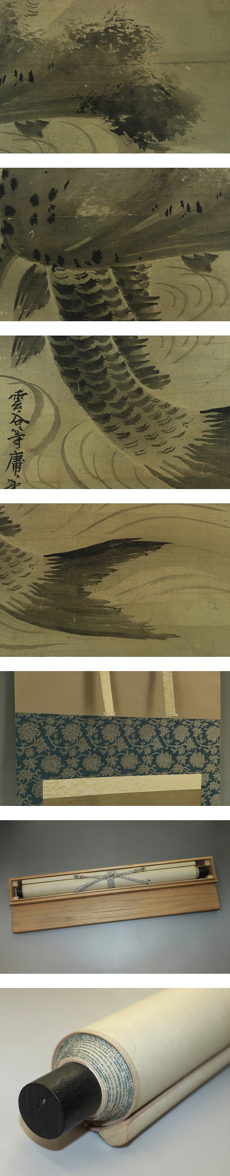 古画 ・雲谷等庸銘【蓮に跳鯉】 本紙は、染み、汚れ、強い折れ、皺、擦れ、虫食、破れ、ヤケがあります。 表装は、染み、皺があります。 【サイズ】 作品 横約39cm×縦約101cm 表装 横約50cm×縦約184cm |