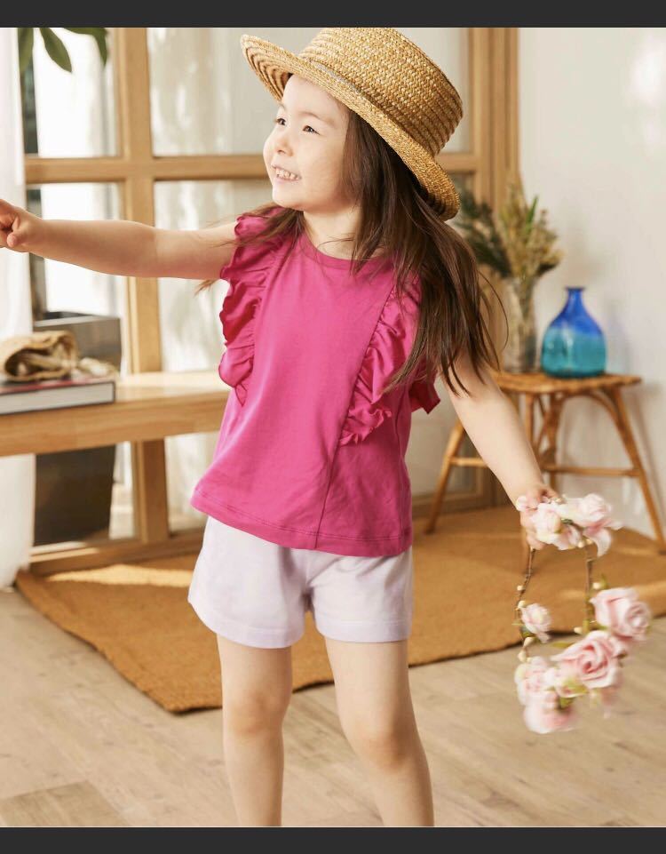 肩のフリルがやや袖のようにも見えるデザインのノースリーブトップスです。