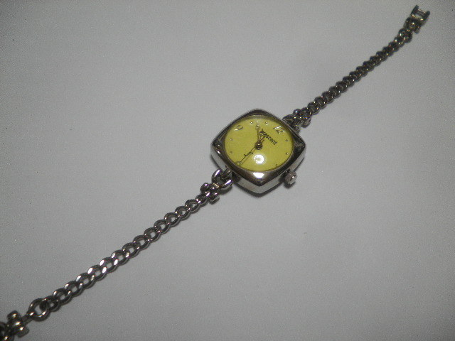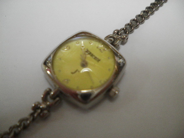 【SALEセール】☆新品☆下げ札なし です!!(モニター環境により色が写真と少し異なる場合があります) ☆サイズ 全長:約 15cm ベルト幅:約 0、3cm ☆文字盤サイズ:約20×20mm(リューズ含まず) ☆文字盤カラー 薄いイエロー系 ☆ベルトカラー シルバー系 ☆仕様 クォーツ(電池式) ムーブメント:日本製 日常生活防水 ☆素材 ステンレススティール、合金、 シルバーメッキ仕上げ ☆保証書、ケース等の付属品は一切ありません ☆処分品のため修理代負担・電池の入れ替え・返品等はお受けできません。その点ご了承の上での入札お願いいたします。 |