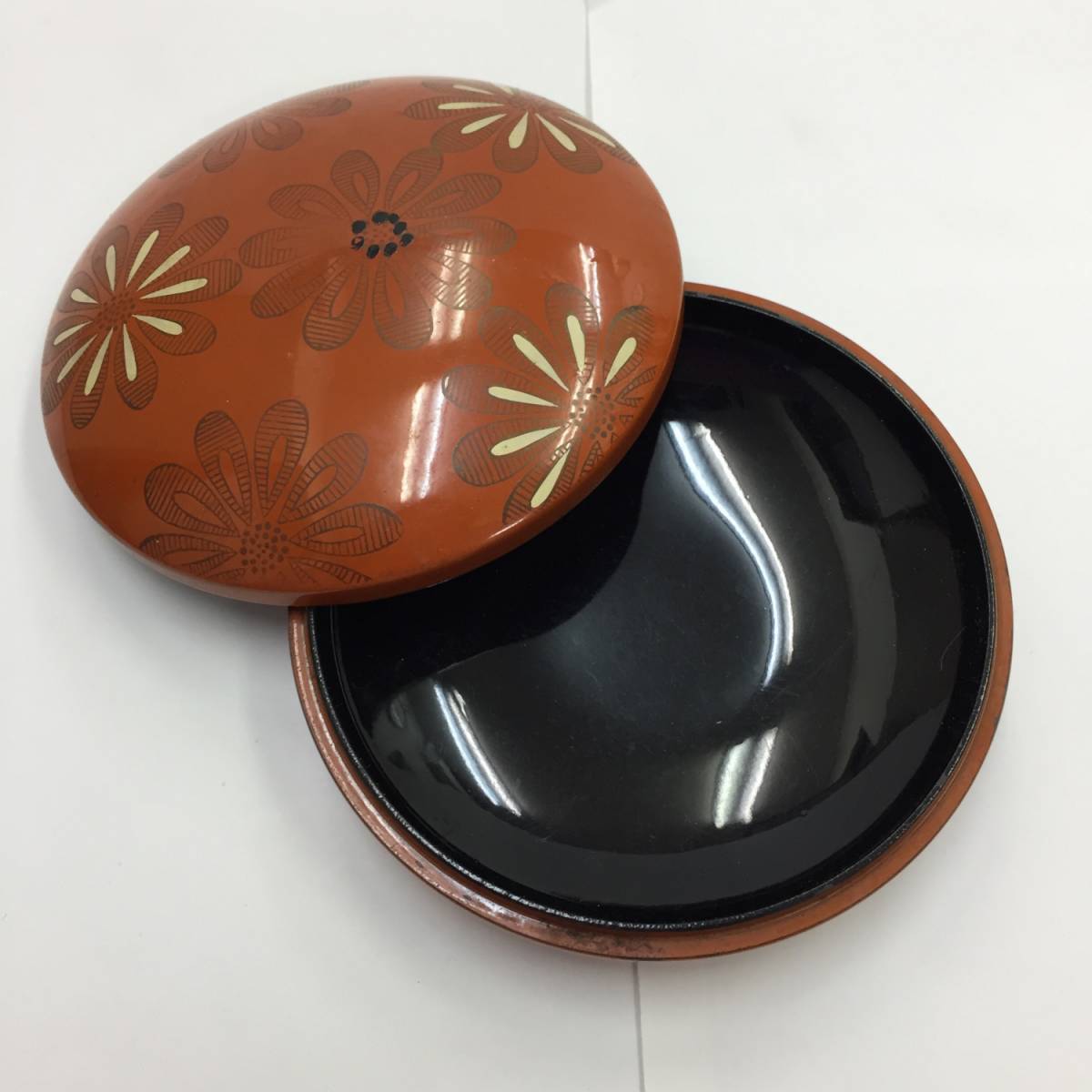 ◎サイズ 直径:約10.5cm 重量:約 56g ※多少誤差は生じると思います。 -------------- ◎状態 年代物の中古品。 画像で一部白抜き加工になっている 部分があります。そこにはどうしても 撮影者の顔や室内が反射して 写ってしまうので、加工で隠しました。 全体的に剥げや傷だらけです。 中も同じく傷だらけです。 裏面には黒っぽい擦り汚れも沢山付いています。 (画像6) 蓋の裏面に観光記念と書いてあります。 記念品ではないでしょうか。(画像5) 上記の通り、状態はあまり良くありません。