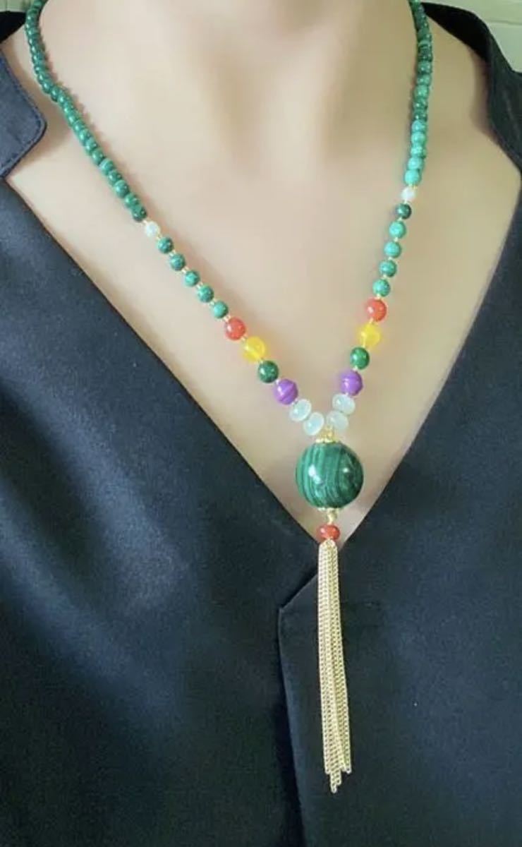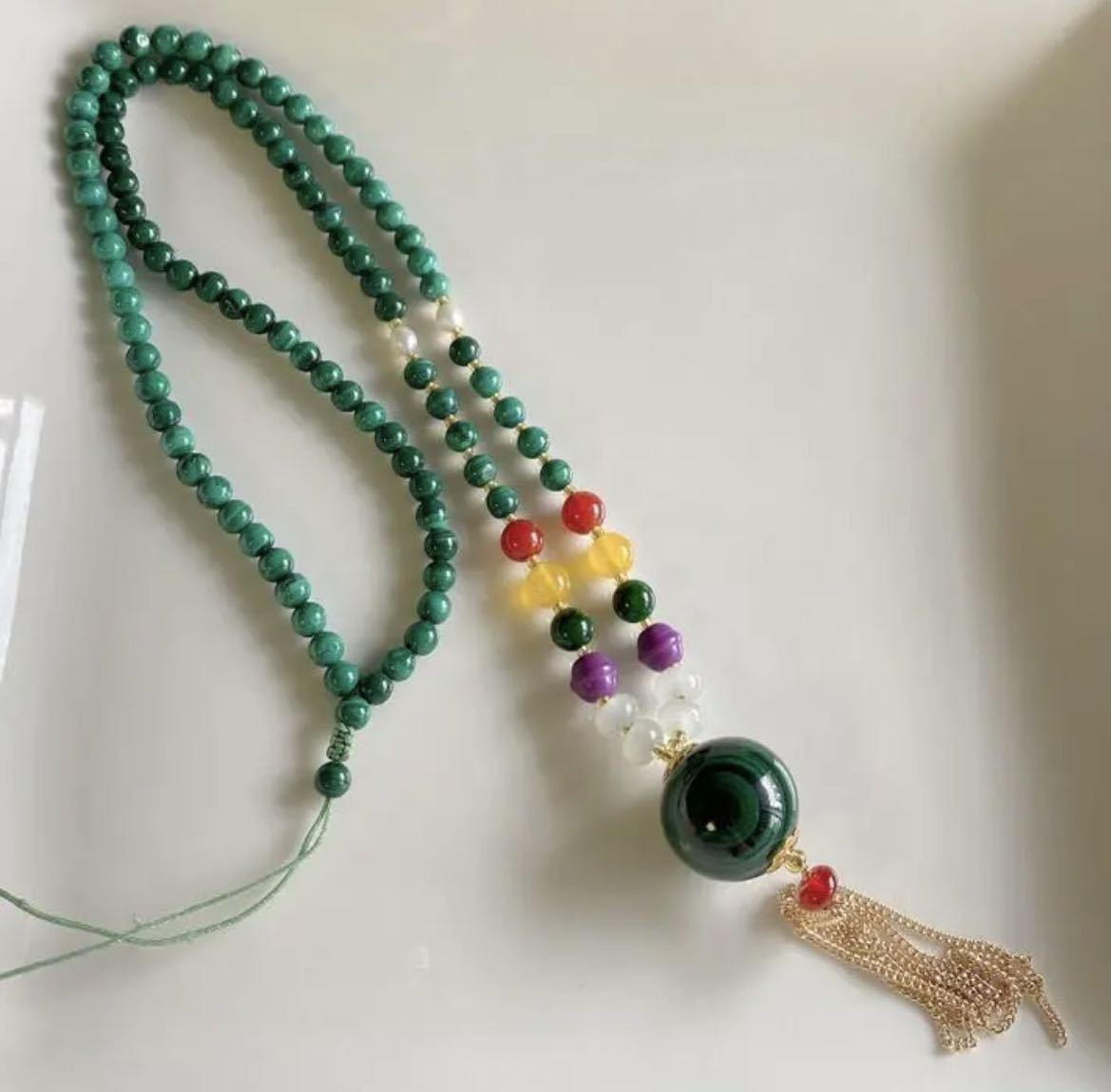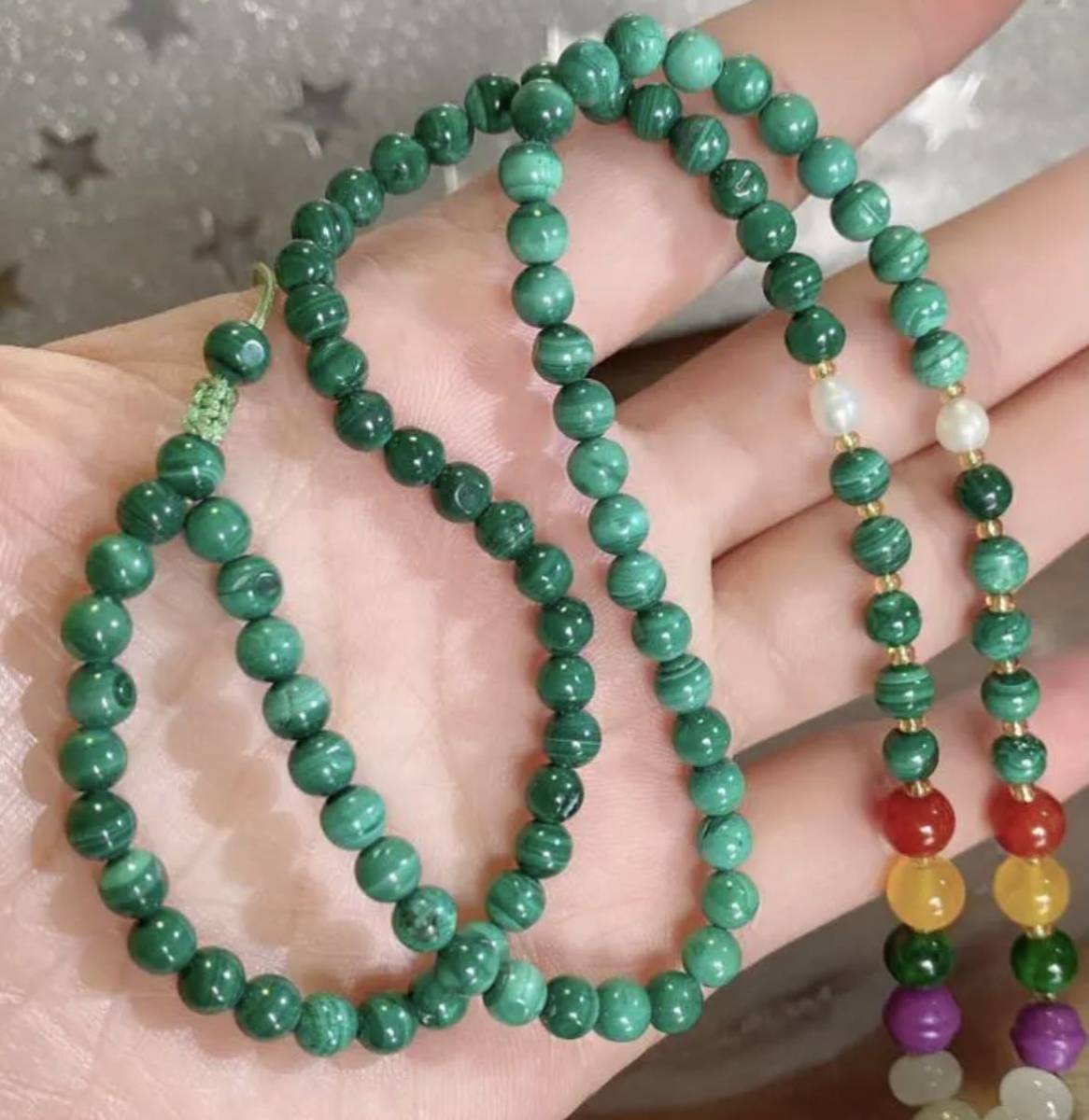 チェーンのマラカイト玉の直径約:4.6mm、チェーンの長さ約50cm、チェーンの長さ調整ができる、重さ約36g、袋付き、商品番号A157;