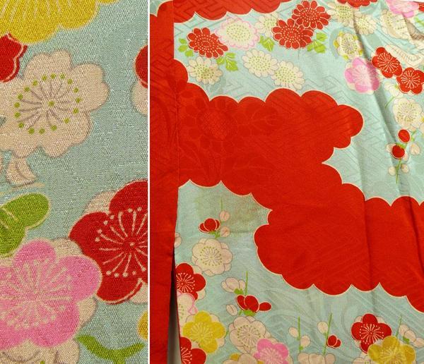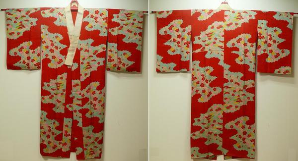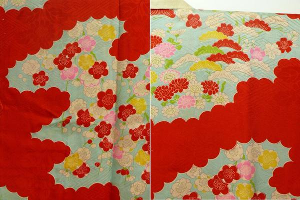 素材:正絹。着丈133.5cm、裄61cm、袖幅31.5cm、袖丈55cm、前幅(おくみ含む)32cm、後幅30cm。裄約1cm、丈約4cm伸びます。前右身頃の胸あたりに5cm×5cmのシミがあります。経年の薄いアク・ヤケ等判り難いですが多少あります。