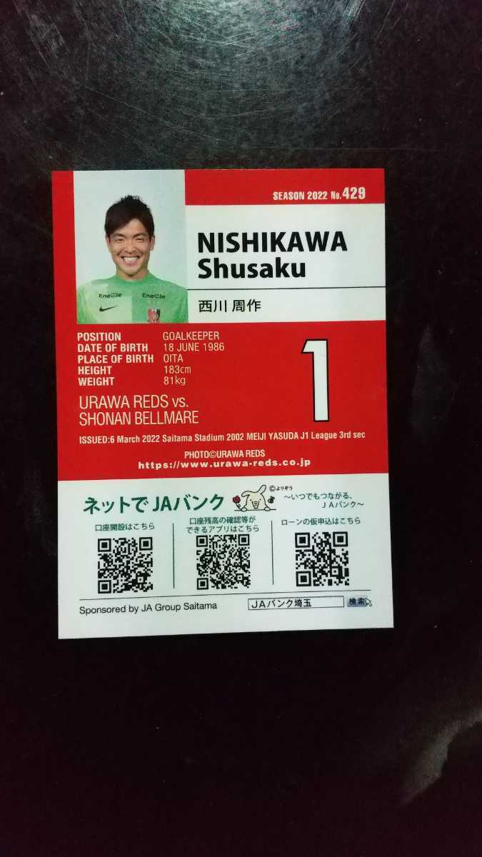 2022年の浦和レッズのマッチデーカードの西川周作選手になります。カードスリーブと硬質のカードケースに入れて発送いたします。新品になりますのでノークレーム、ノーリターン、ノーキャンセルでお願いします。
