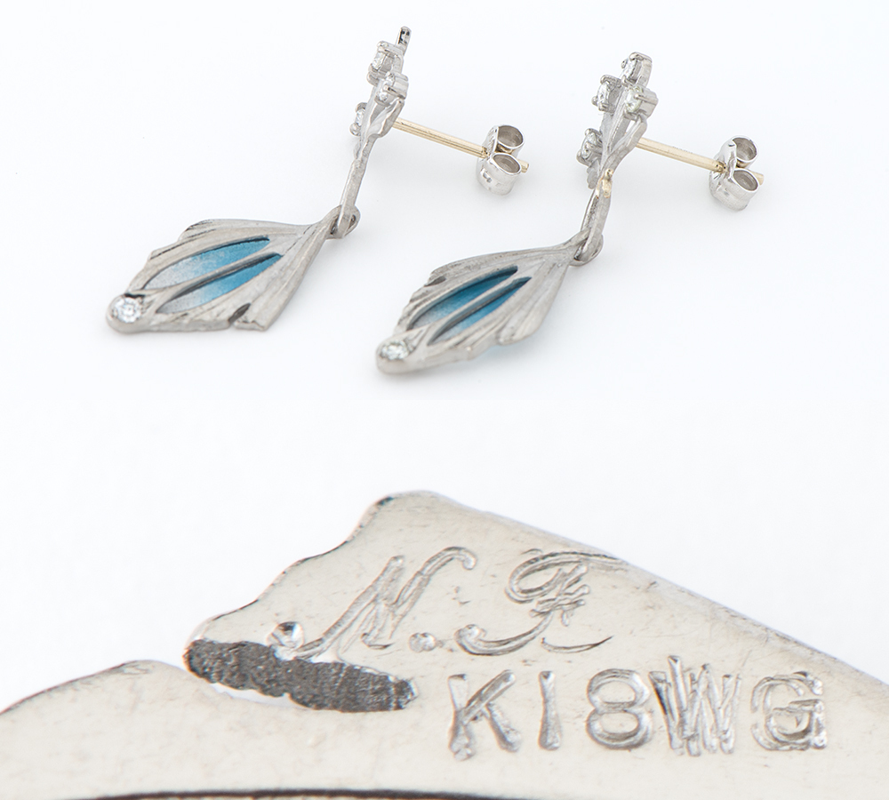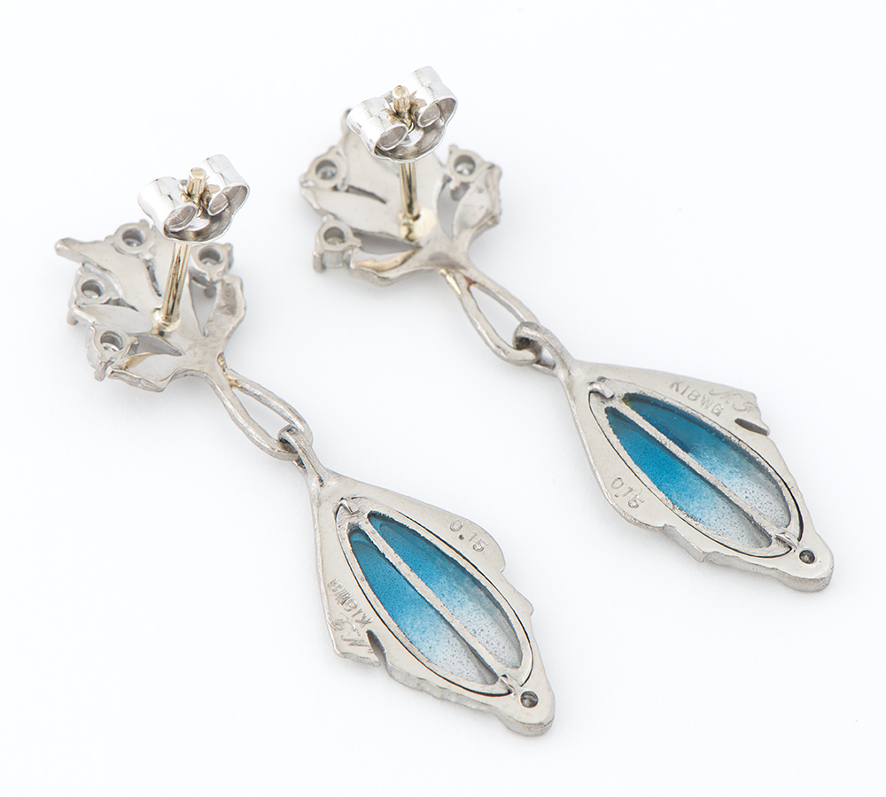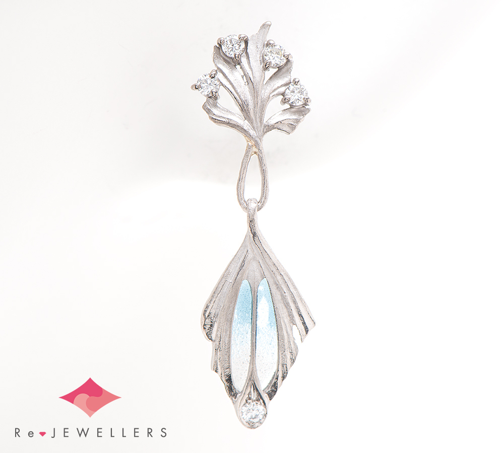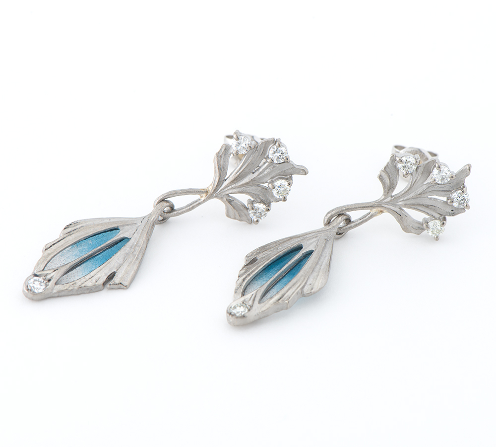 エマイユ技法を用いて独特の世界観を魅せる中嶋邦夫のニックスファクトリー。絵画を想わせる繊細な色遣いは、青から無色のグラデーションが涼やかな印象を与え、ゆらゆらと揺れる様が目をひきます。自然をモチーフにした艶消しのホワイトゴールドが放つ上品な輝きは、柔らかなデザインにマッチ。ジュエラーのこだわりを感じる、エレガントで芸術的なジュエリーです。