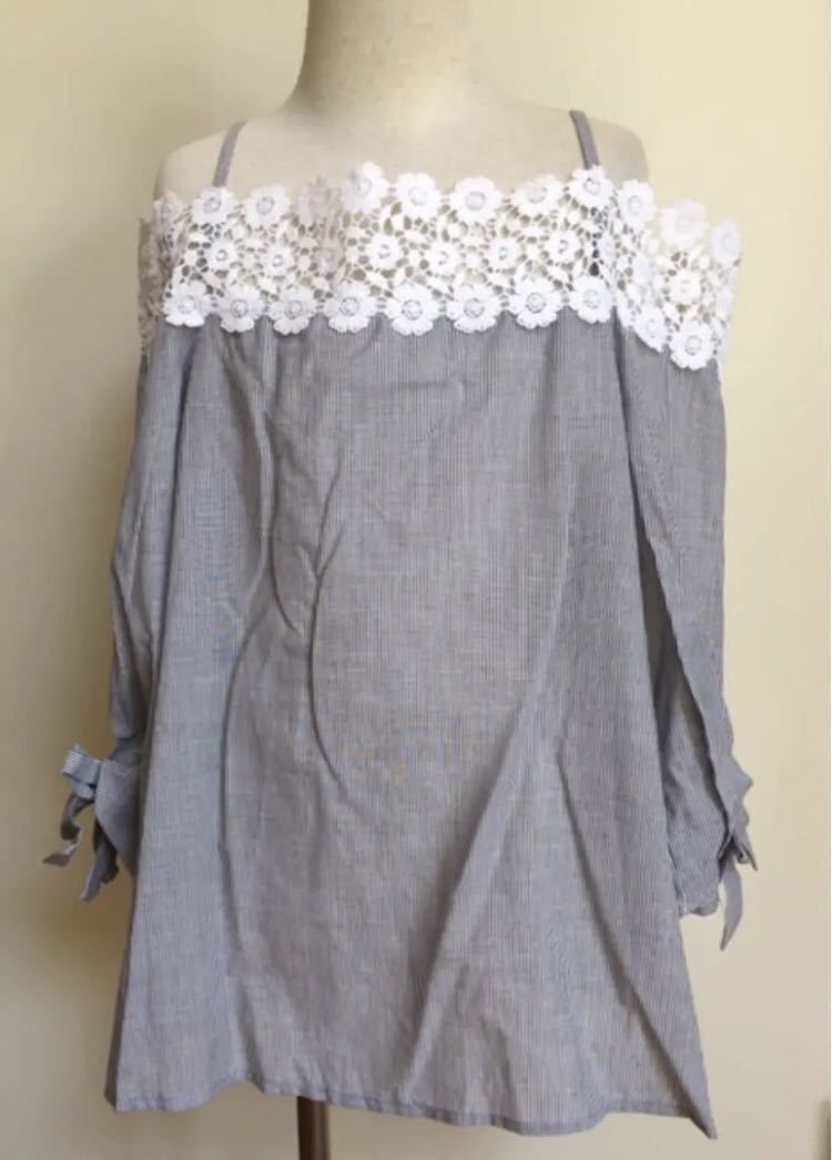 細ストライプ柄胸元レース使いが素敵なオフショルダートップスです。