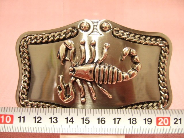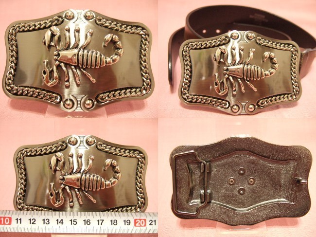 商品の説明 | 大変インパクトの有る美しいデザイン、優雅な感覚に癒されます。 薄黒みかかったシルバーのベースと、厚みがあり立体的な銀色スコーピオン素敵です。 美しい色合いと魅力的なデザインは目を引き、きっと気に入っていただけると自信を持っております。 男女兼用のバックル、中型サイズでとても目を引きます。 さりげなく付けてみては、いかがでしょう。 ※ベルトは比較イメージで商品には付きません。 | ||||